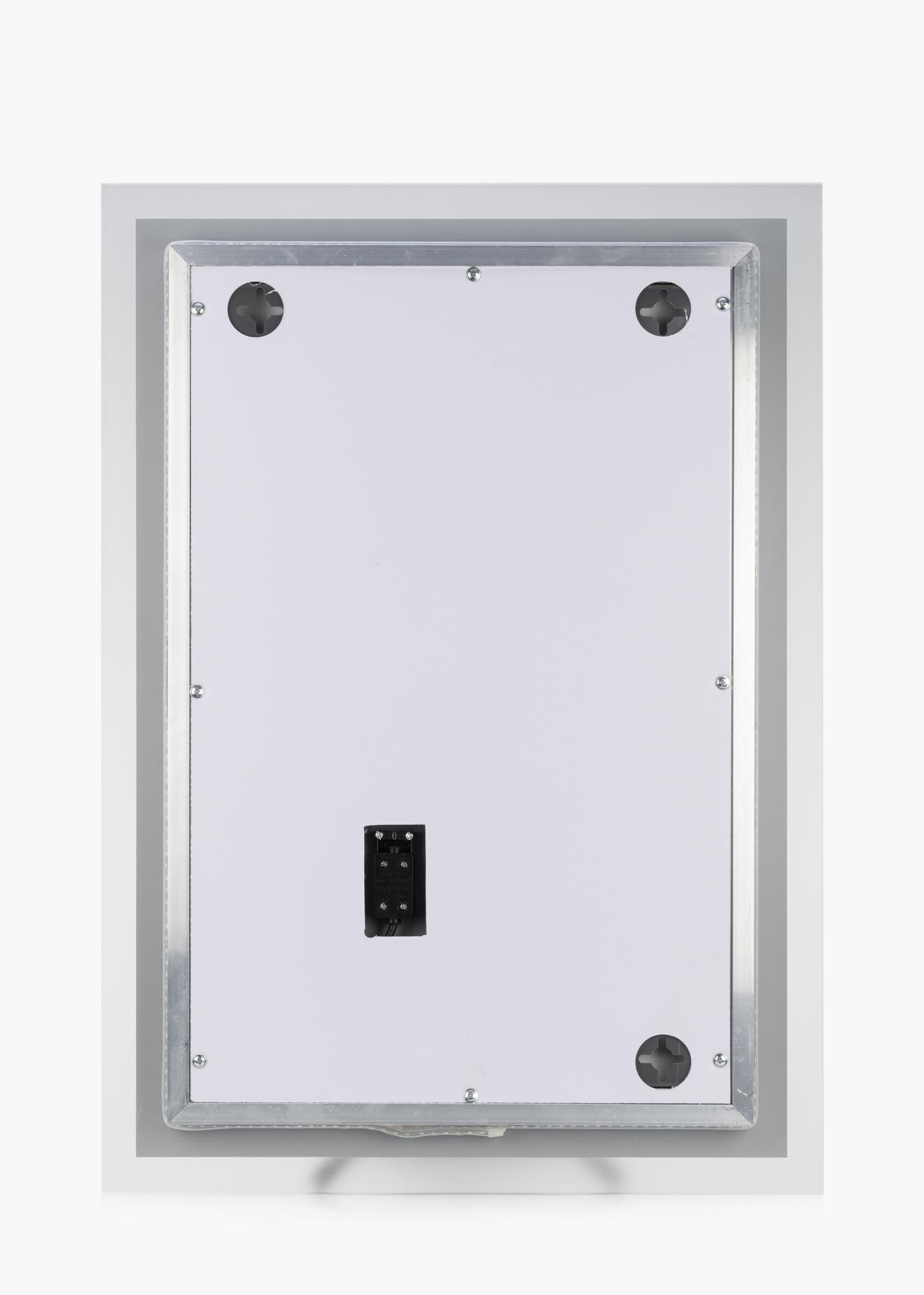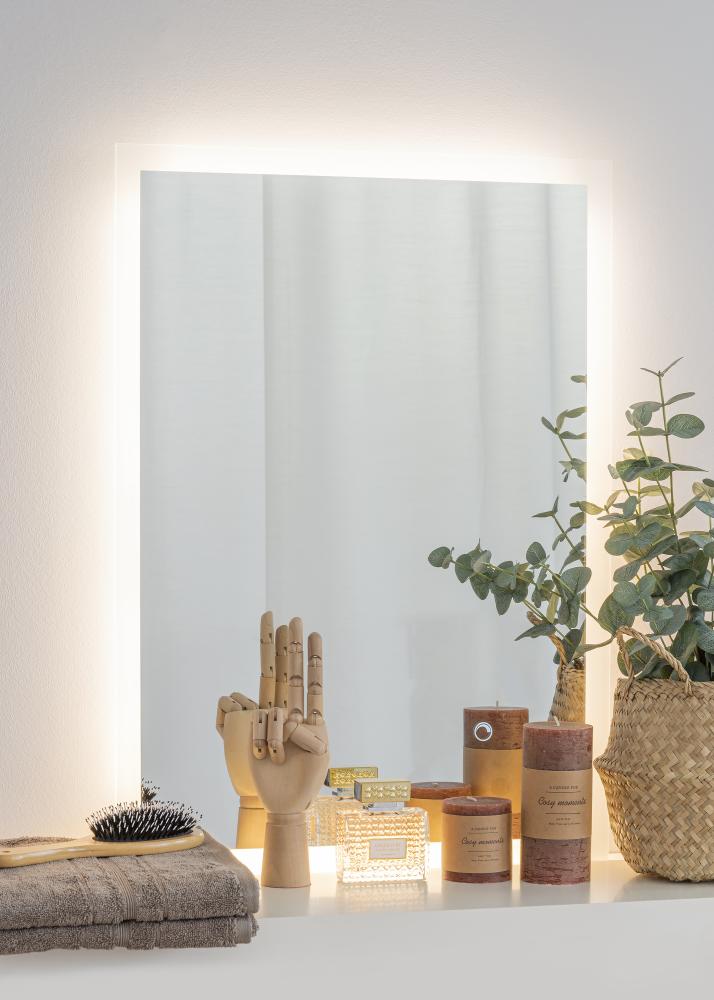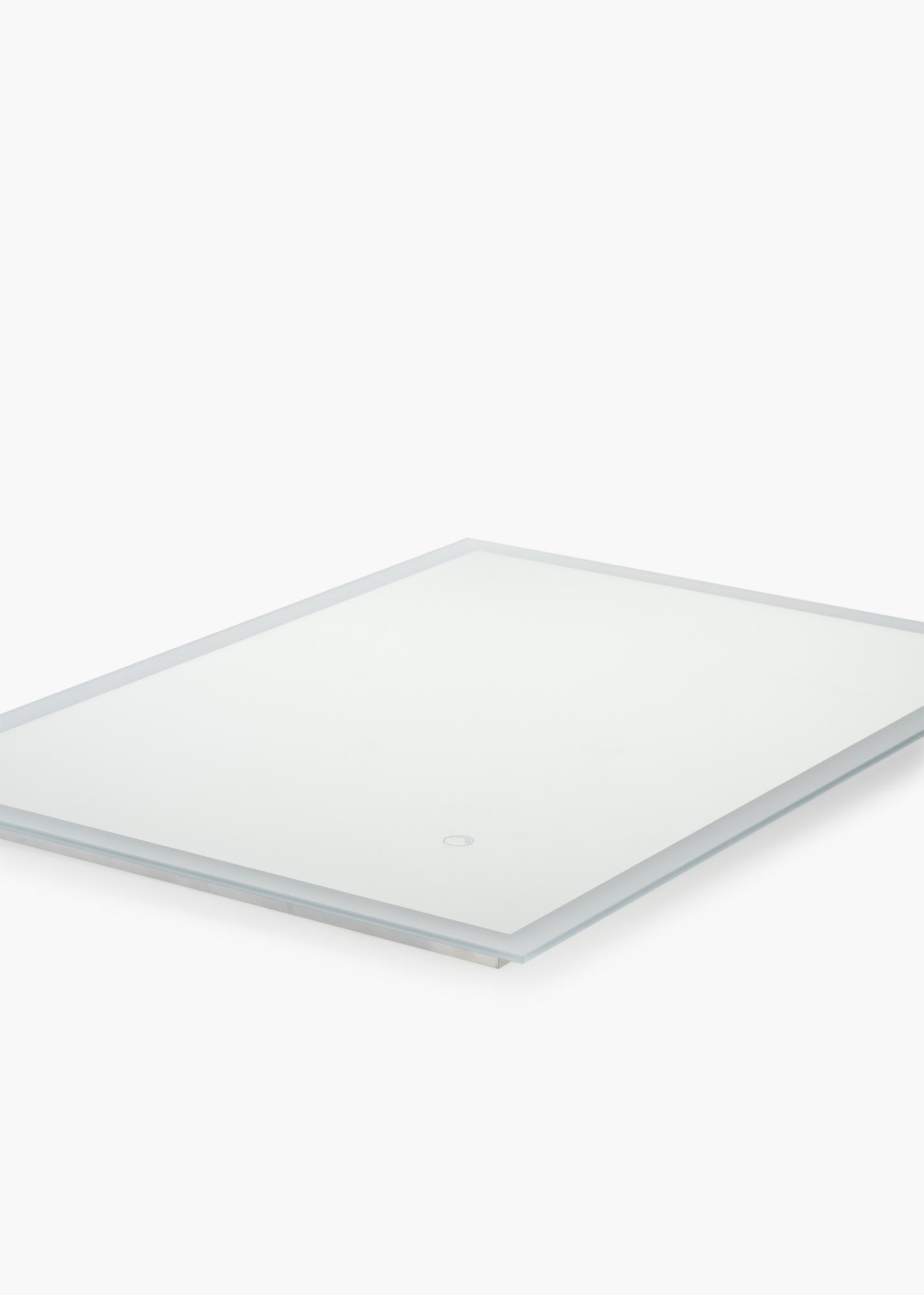 This attractive, Swedish design mirror from KAILA has a rectangular shape with frosted edges. Behind the stylish edges, the mirror has integrated LED lighting, which lights up the mirror with a pleasant, warm and white 3000K light. The LED lighting is adjustable, and you can easily adapt the strength of the light to your preferences by holding down the watertight touch button on the screen for a couple of seconds. The mirror automatically remembers your most recent light setting for the next time you turn it on. LED is an energy efficient light source which gives an even and natural light. For the mirror to function correctly, it must be connected to a standard switch, not a dimmer switch.