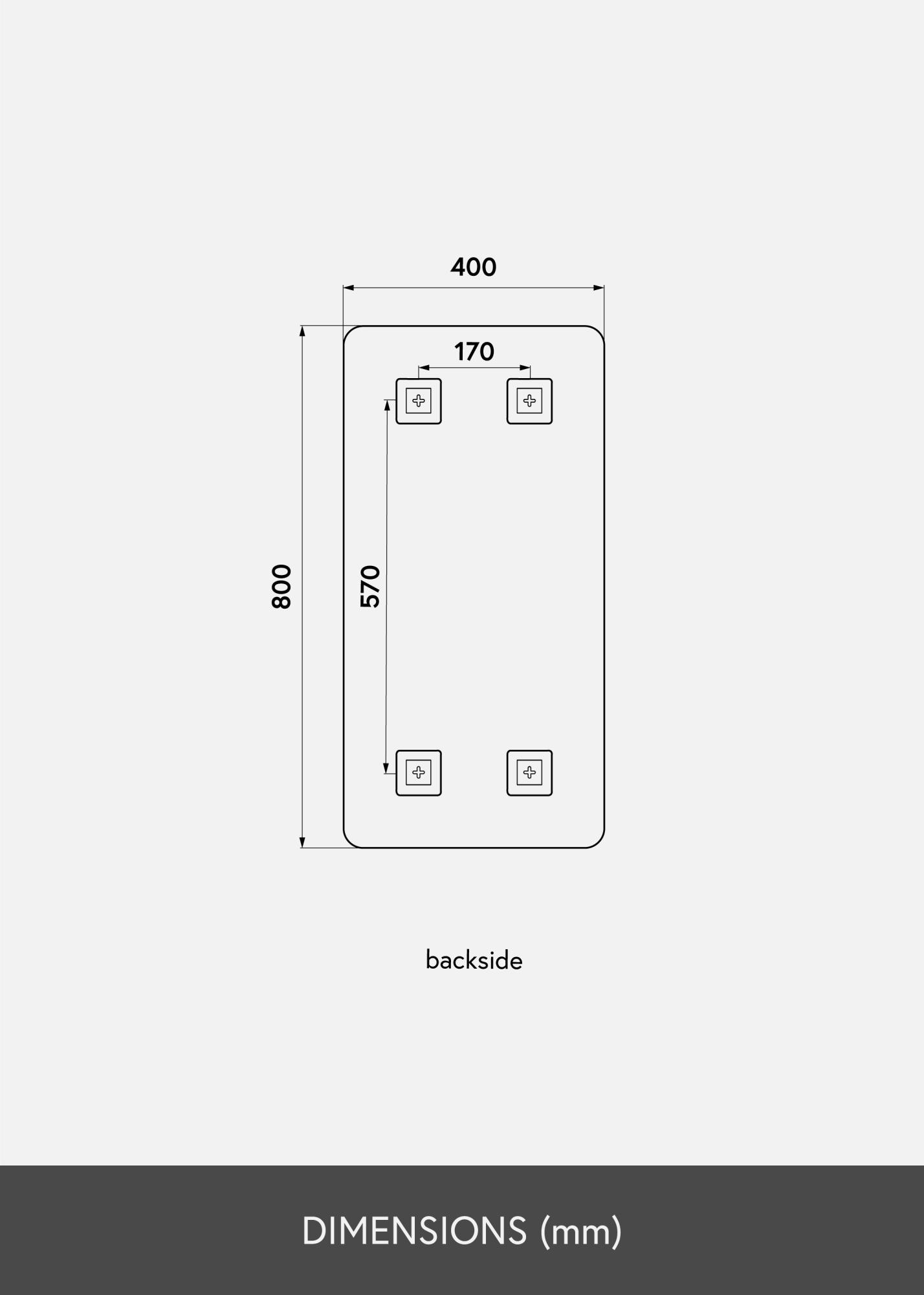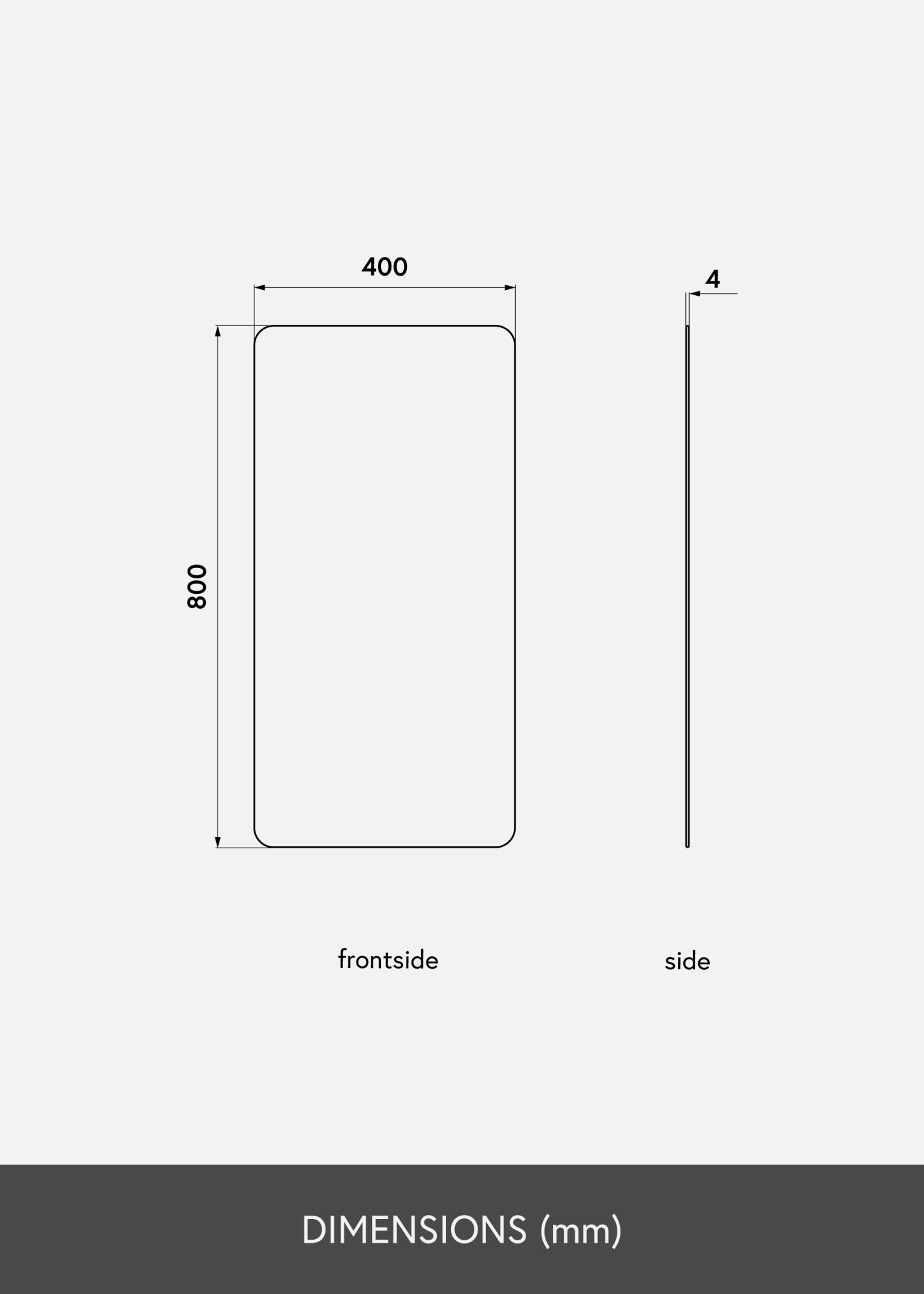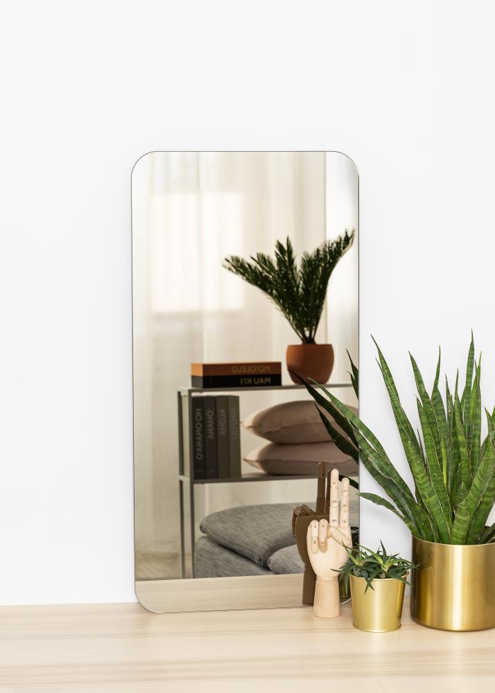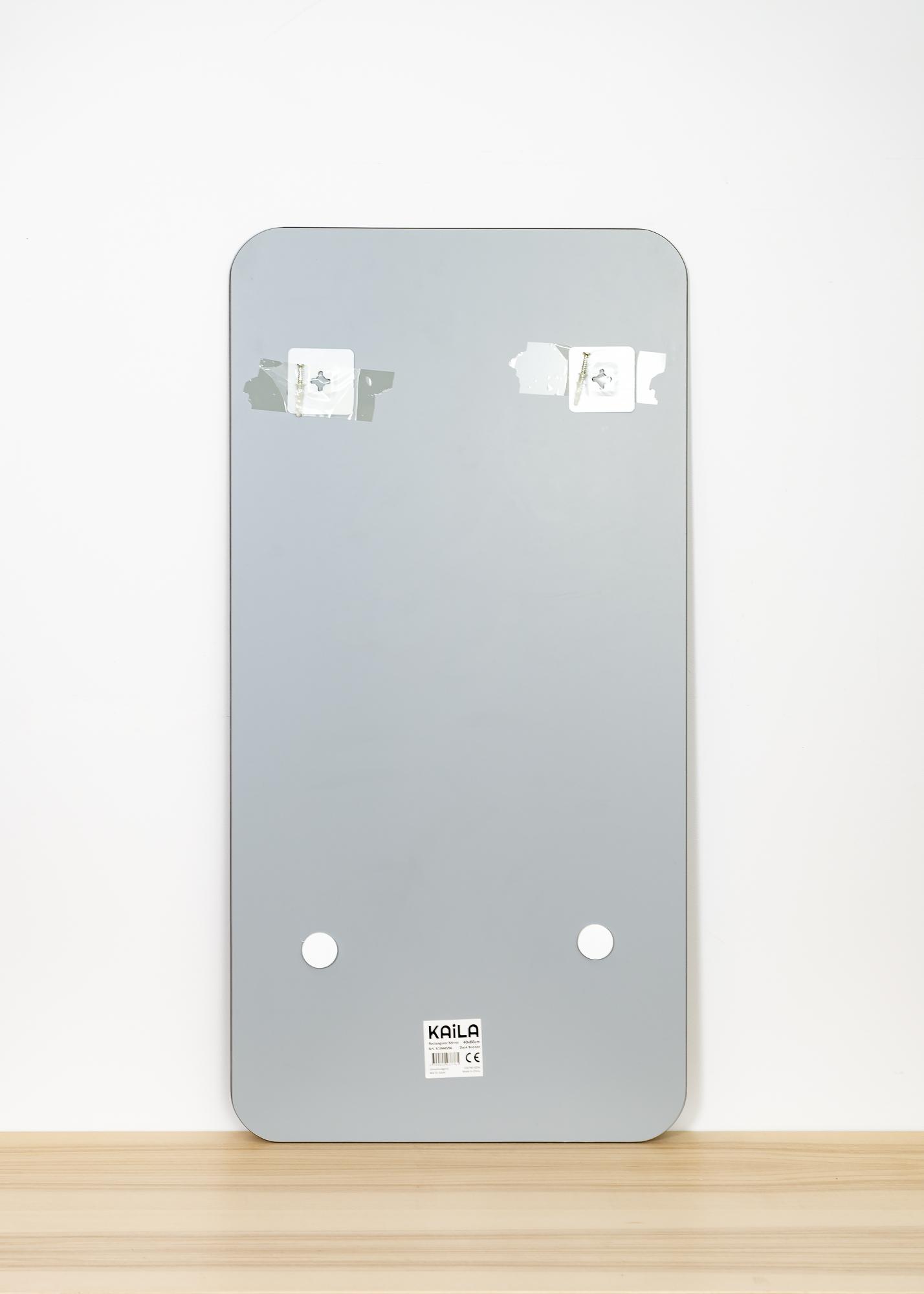 This is a rectangular mirror with decorative rounded corners that give a soft and elegant impression. The mirror glass is toned in a stylish shade of dark bronze, making this mirror a decorative detail that is both fashionable and striking. The mirror is also very thin and has no frame, further giving it a slender, stylistically simple feeling.
