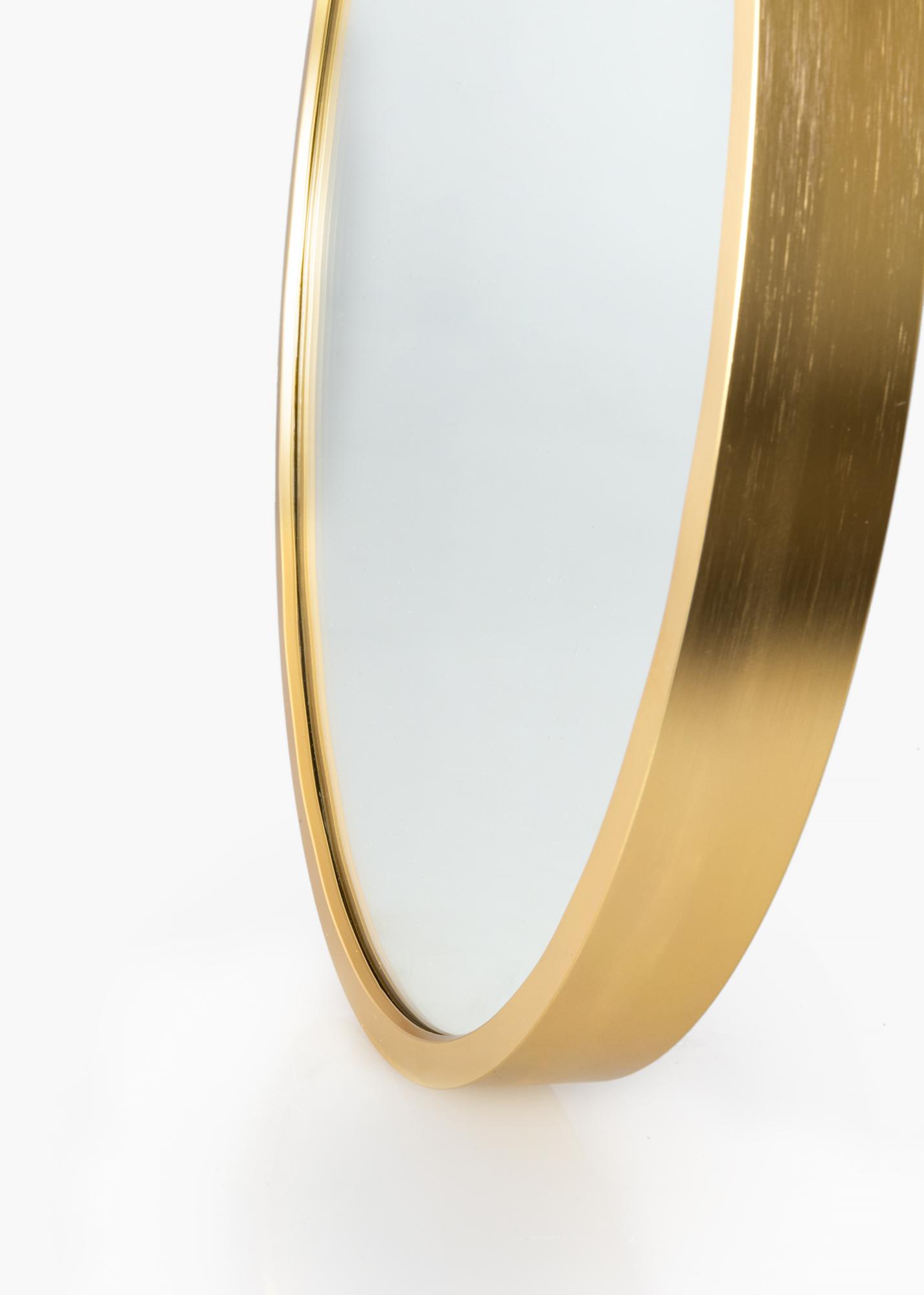 A round mirror in a stylish Swedish design with a metal frame in beautiful gold. The frame has a brushed surface, which gives the lovely gold colour a slightly duller look. It also has a trendy frame that's thin but at the same time deep - between 30-40 mm deep depending on the size - meaning that it stands slightly off of the wall for a cool 3D effect. The frame's depth also makes the mirror feel solid and robust, without affecting its minimalist feel.