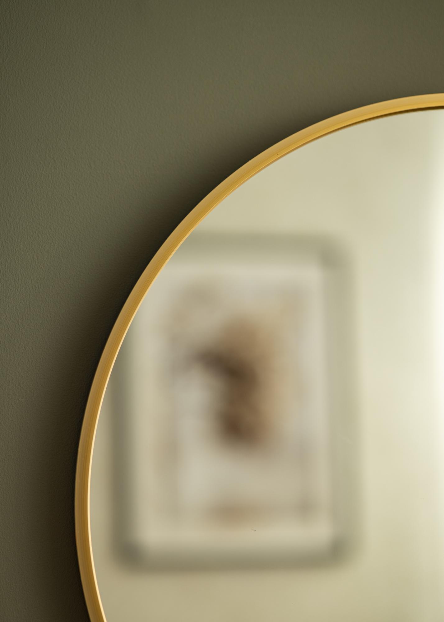 A round mirror in a stylish Swedish design with a metal frame in beautiful gold. The frame has a brushed surface, which gives the lovely gold colour a slightly duller look. It also has a trendy frame that's thin but at the same time deep - between 30-40 mm deep depending on the size - meaning that it stands slightly off of the wall for a cool 3D effect. The frame's depth also makes the mirror feel solid and robust, without affecting its minimalist feel.