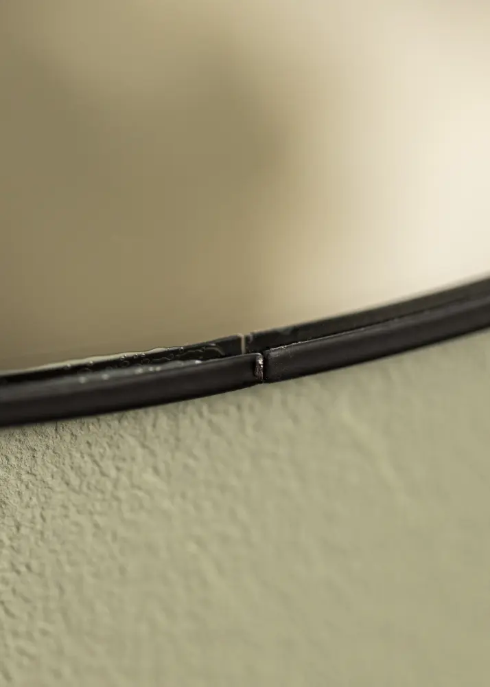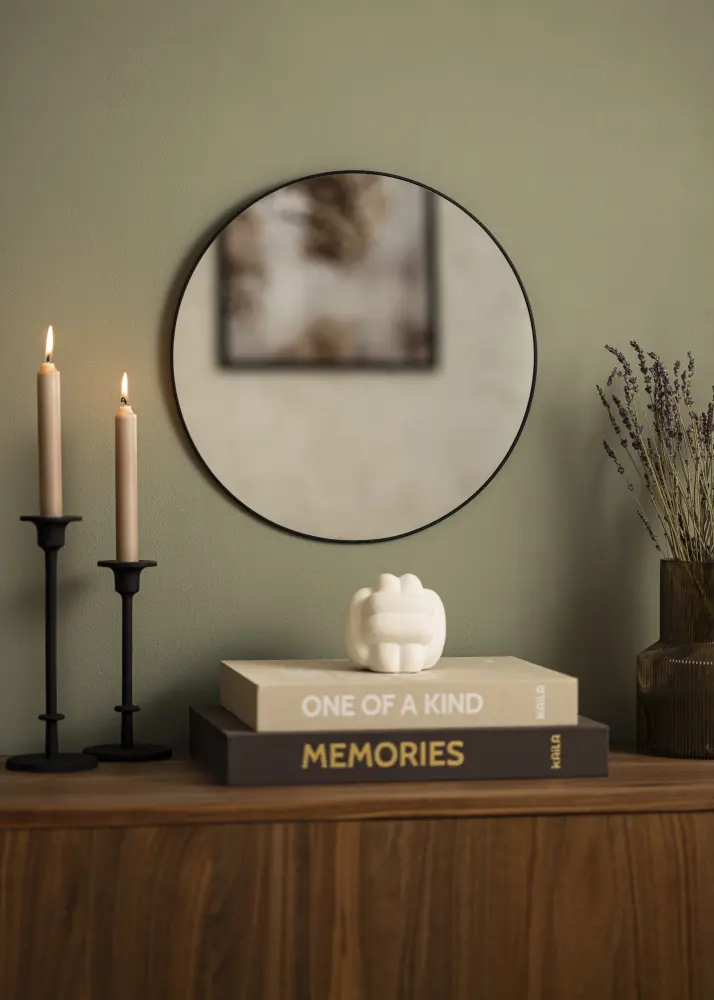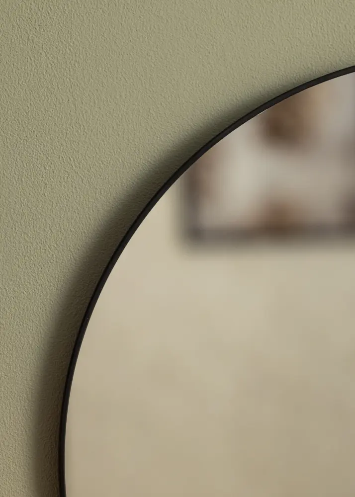 This is a round mirror with a thin, stylistically black metal frame. The thin black frame gives the mirror an industrial look, but it suits all homes and decors thanks to its pared-back design, which can create both perfect harmony and attractive contrasts. Hang the mirror alone on the wall, or together with other decorative details.