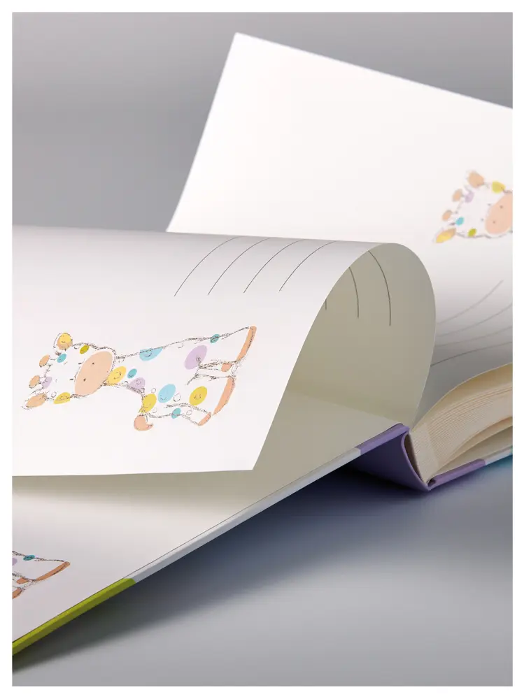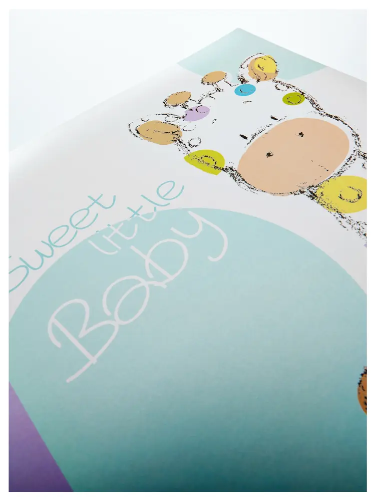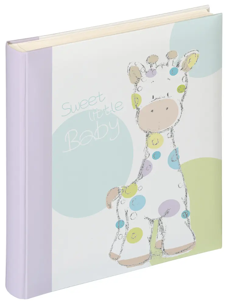 Assemble all your photos of the best little ones in the world, in a sweet album with a giraffe theme! This kids' album has illustrations of a cute giraffe cub with spots in a variety of pastel colours, together with the text "Sweet Little Baby". The album's first entry displays a giraffe, with 4 black lines for text.
