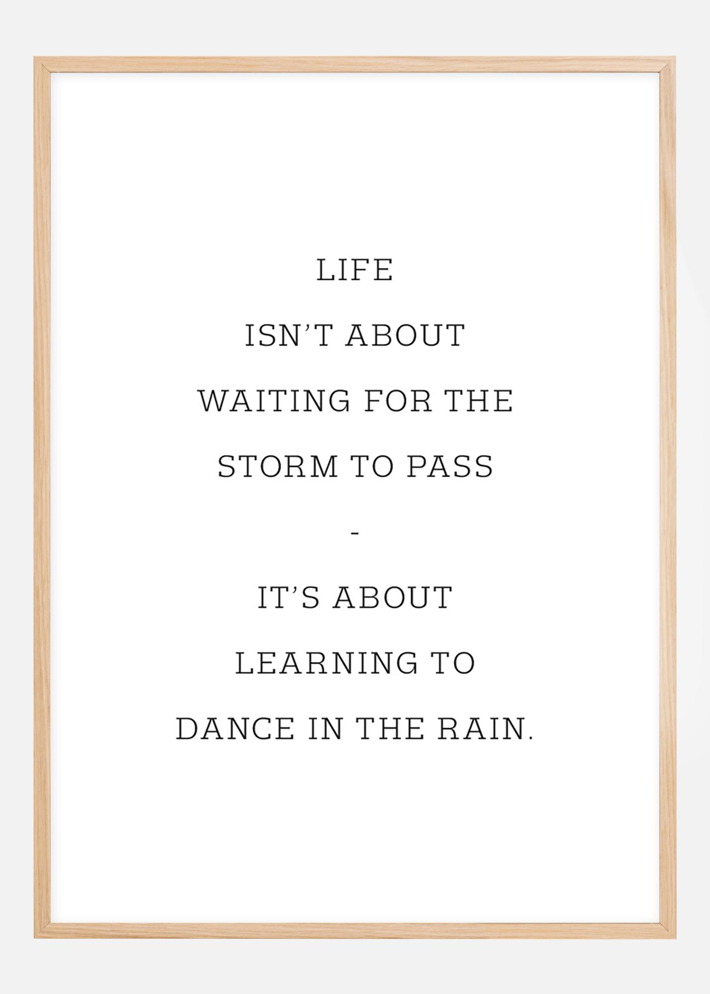 A meaningful black and white motivational print highlighting the importance of facing up to problems. Written in simple bold black capital letters the message comes across clearly. Life isn't about waiting for the storm to pass- it's about learning to dance in the rain. A simple yet modern picture to hang on a white wall.