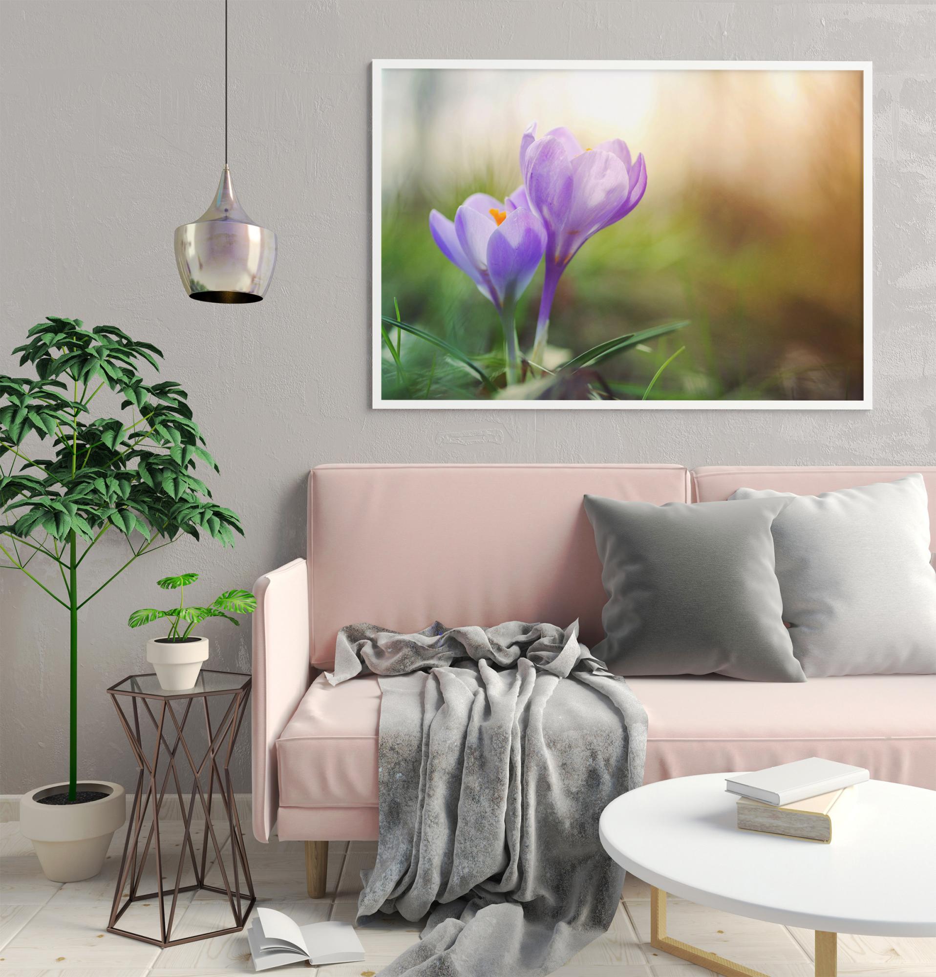 A charming picture of perhaps the most colourful worshipper of spring, the crocus. The blurred background in a complementary colour lifts the flowers and brings harmony to the photograph. Suitable for those who want joy of colour in their home and it's always nice to use a shade from the painting as an accent colour in the rest of the decor. Feel free to combine with other plant motifs to create a cohesive feel in the room.