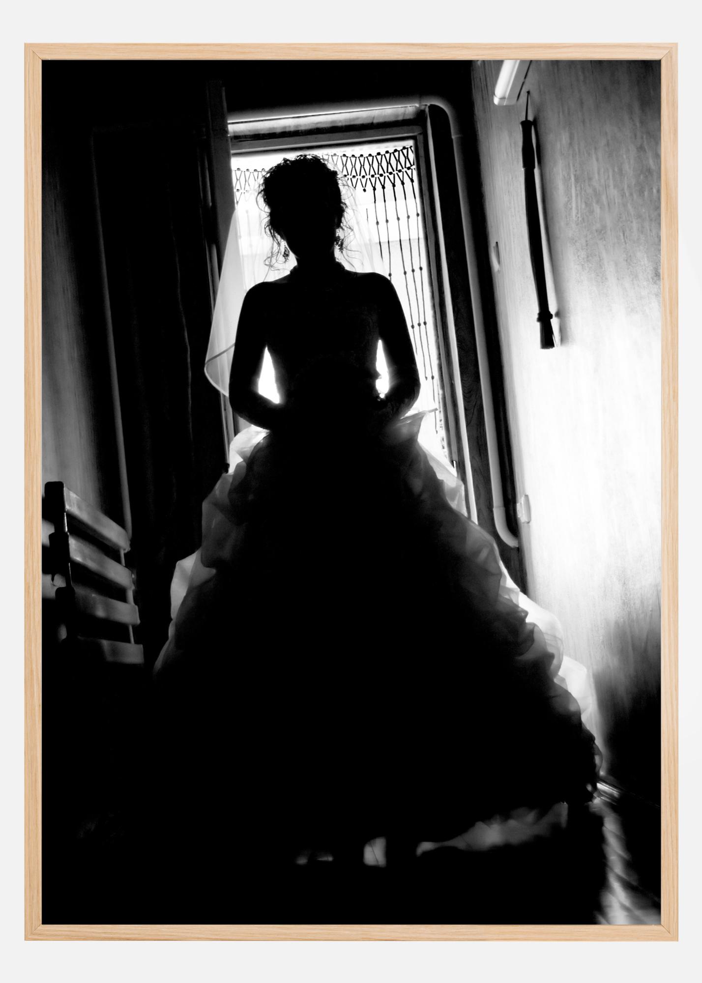 Photographic art in dark grayscale of a bride photographed in backlight. A dark and diffuse poster that creates interest and curiosity. Feel free to combine with other favourites for a larger, more vibrant picture wall.