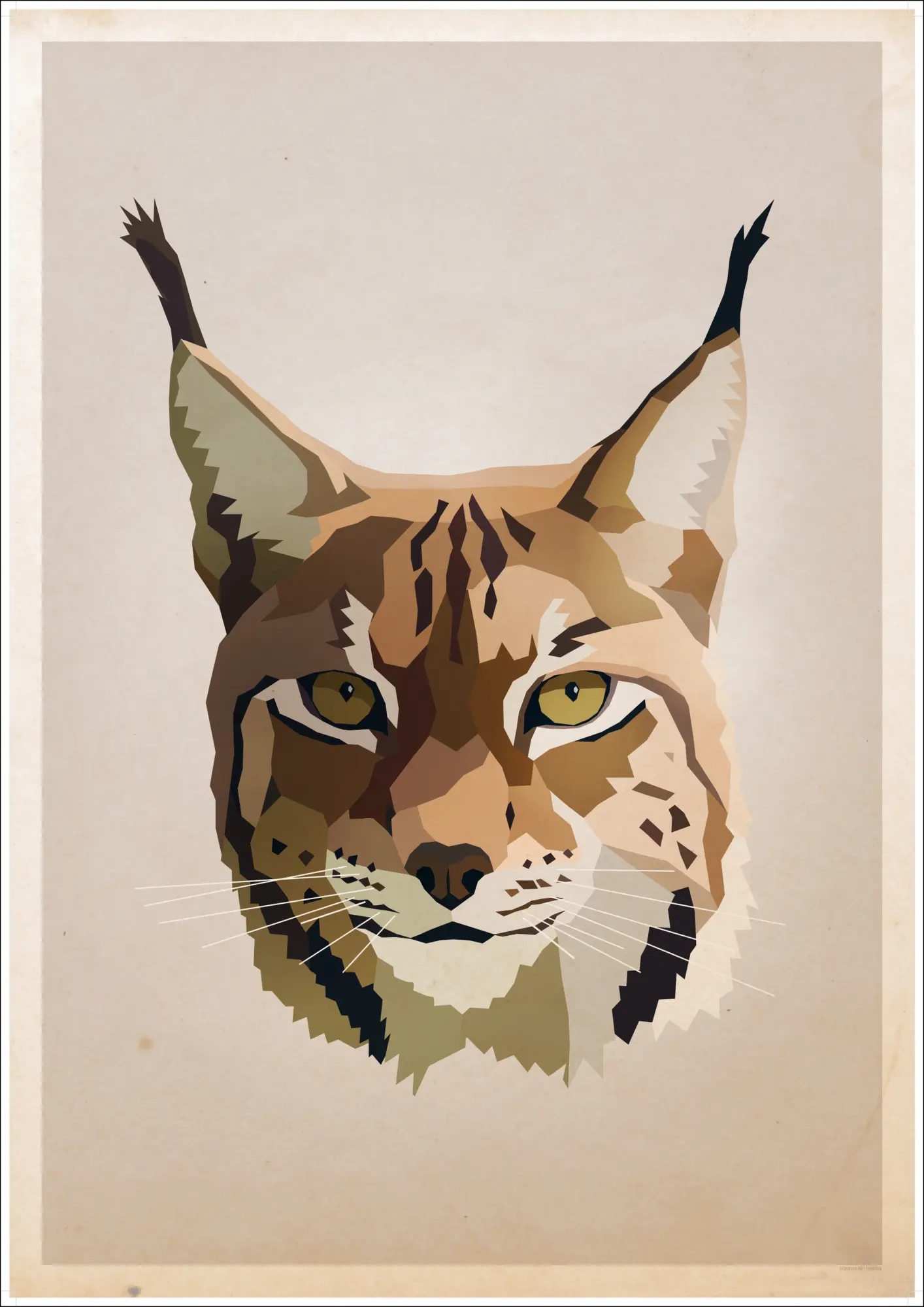 A intense pastel coloured print of a beautiful lynx. Set on a pale pink background, the lynx eyes represent an attentive yet dominant look. The different brown and green pastel colours blend in beautifully with the lynx's eyes.