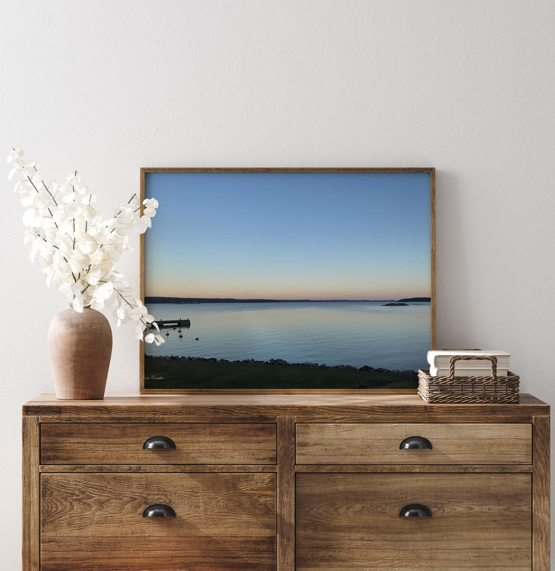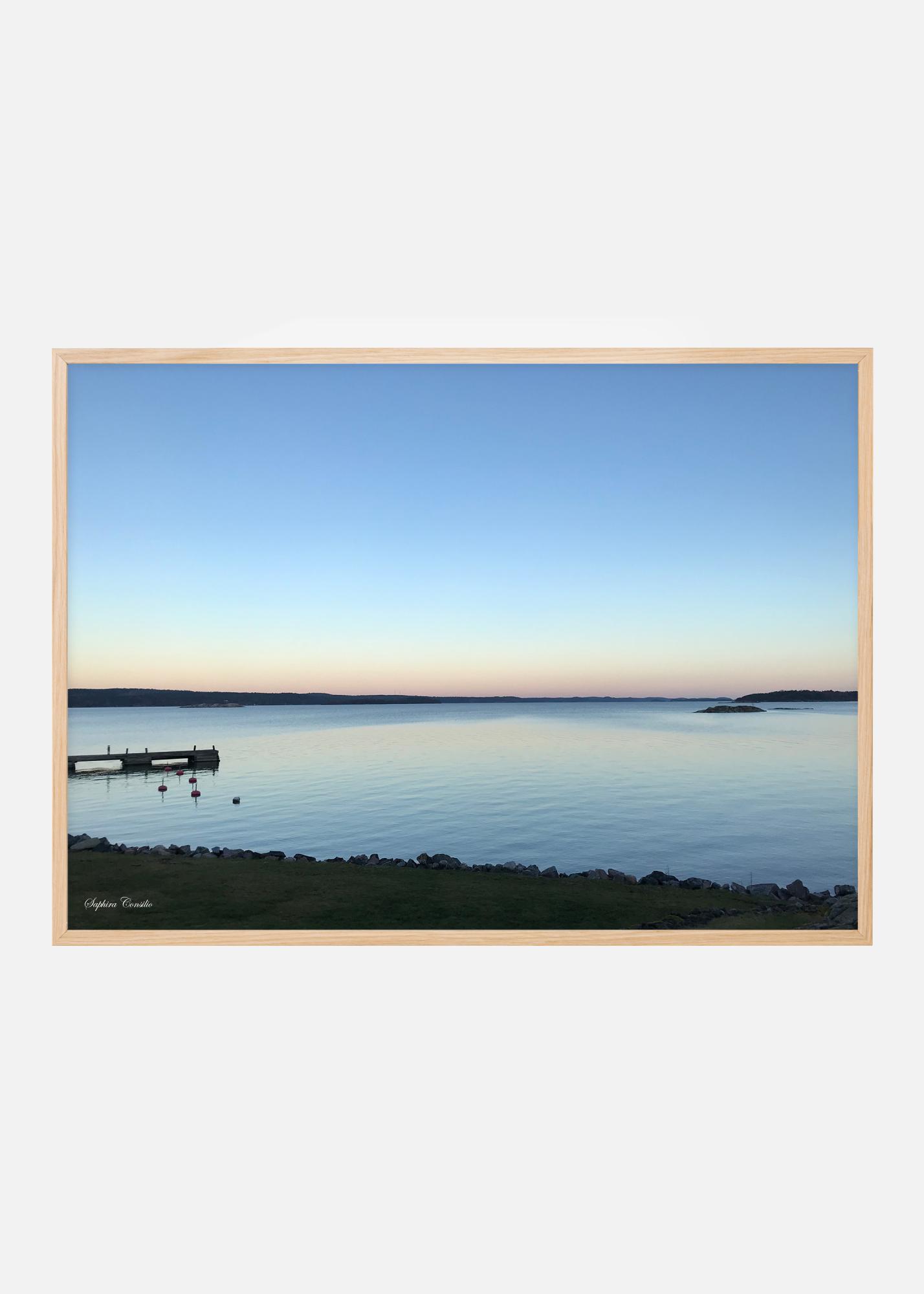 A photographic poster of the Swedish archipelago with its islands and skerries in a beautiful sunset. A jetty with its adjacent mooring buoys adds a little extra life to the image. A wonderfully soothing poster created by photographer Saphira Consilio.