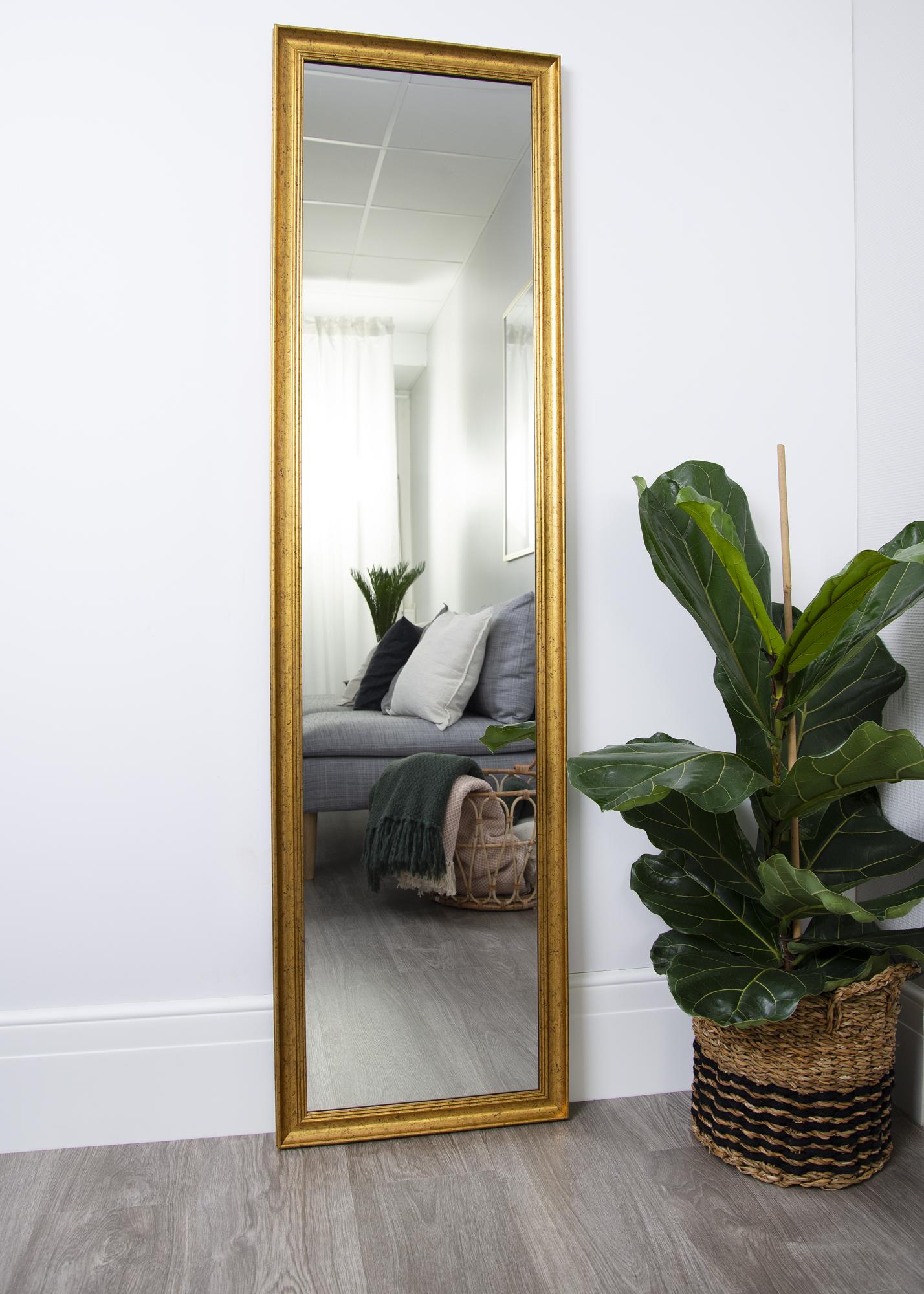 Stylish carved gold mirror with an antique treatment that makes the frame come alive. This mirror fits perfectly in a home with furniture in a similar style or in a glamorous walk-in wardrobe, where it won't take up too much space but still shows the whole body. Combine with interior design accessories in brass or gold to create a consistent look in the space and to make the mirror stand out.
