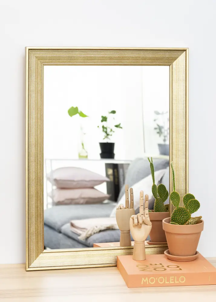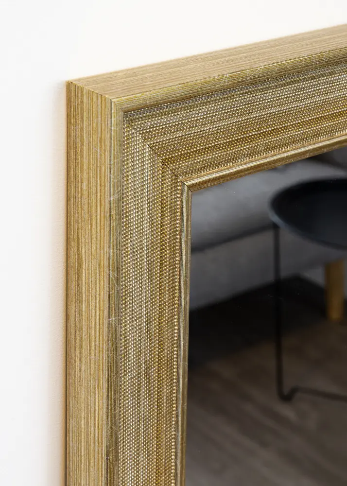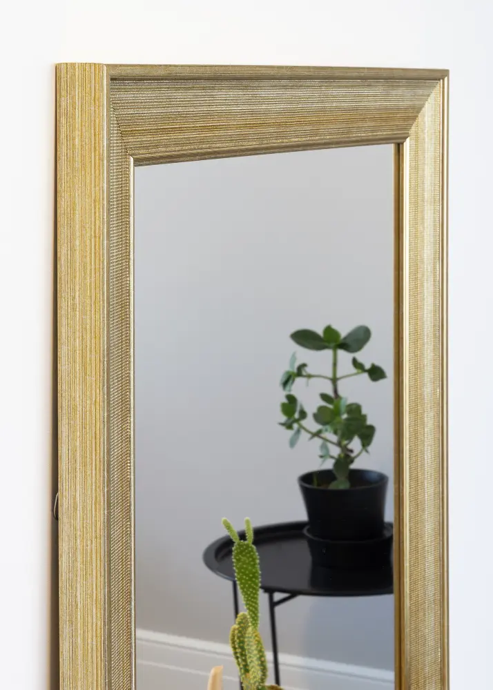 Decorate your wall with a beautiful gold mirror that you match with other accessories in the same colour. The mirror's frame has classic carving closest to the glass and at the outer edges, while the wide middle section has a texture reminiscent of tiny gold chains.