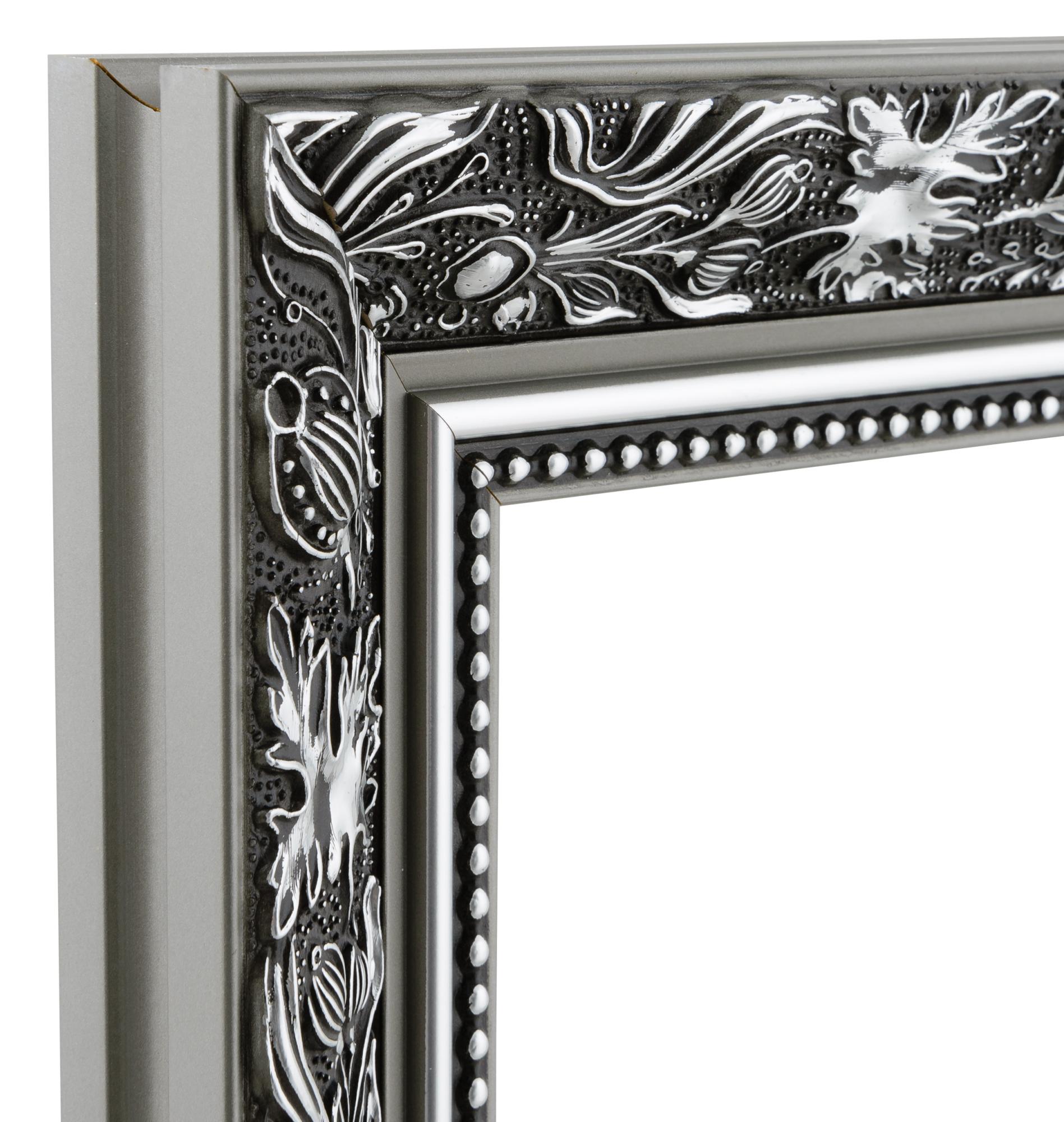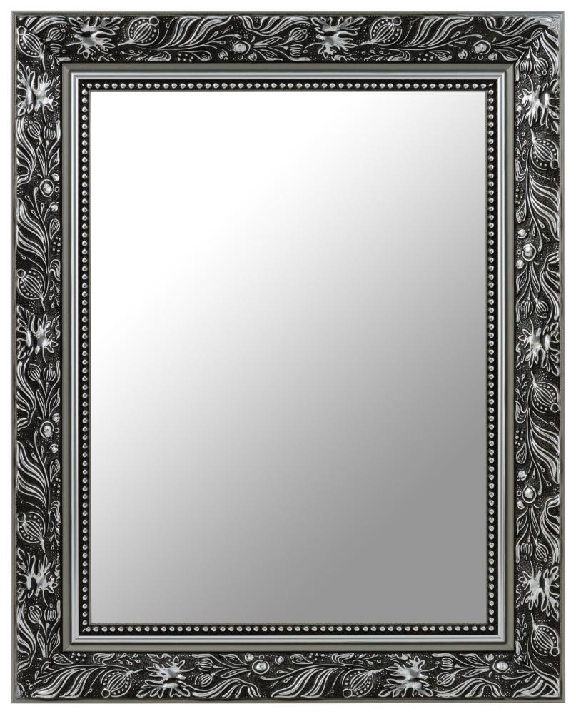 Frame your reflection in style with this gorgeous black and silver mirror! The mirror's frame has both matt and glossy details, making it very decorative. There's a wide section with patterns of leaves, smooth sections in matte and glossy silver, and a pearl-effect ribbon closest to the glass. This mirror is manufactured in our own frame workshop by highly skilled craftsmen, so you can expect a high quality product!