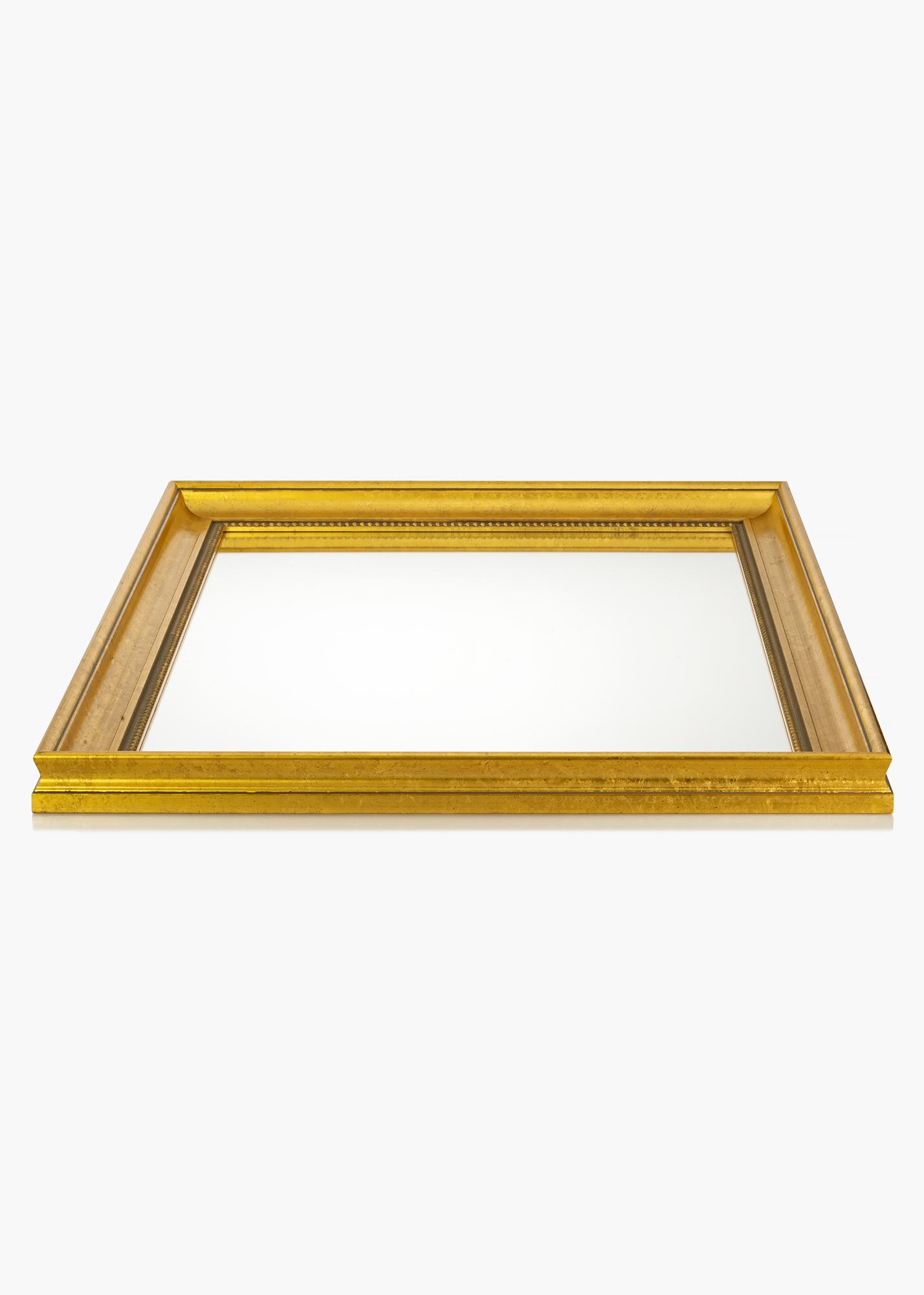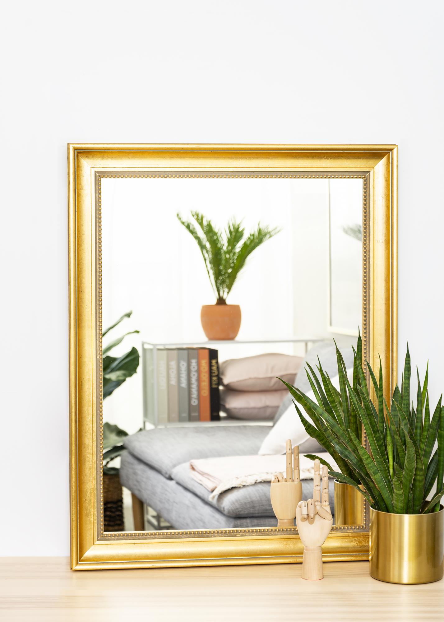Acquire a chic mirror and make the interior of your hallway, living room, or bathroom extra luxurious. This stylish mirror is available in several different sizes so you can easily find one that suits your purpose. The mirror frame has a classic design with a wide frame and a subtle pearl pattern closest to the glass. The wood comes from sustainable forestry and is painted in a beautiful shade of gold.