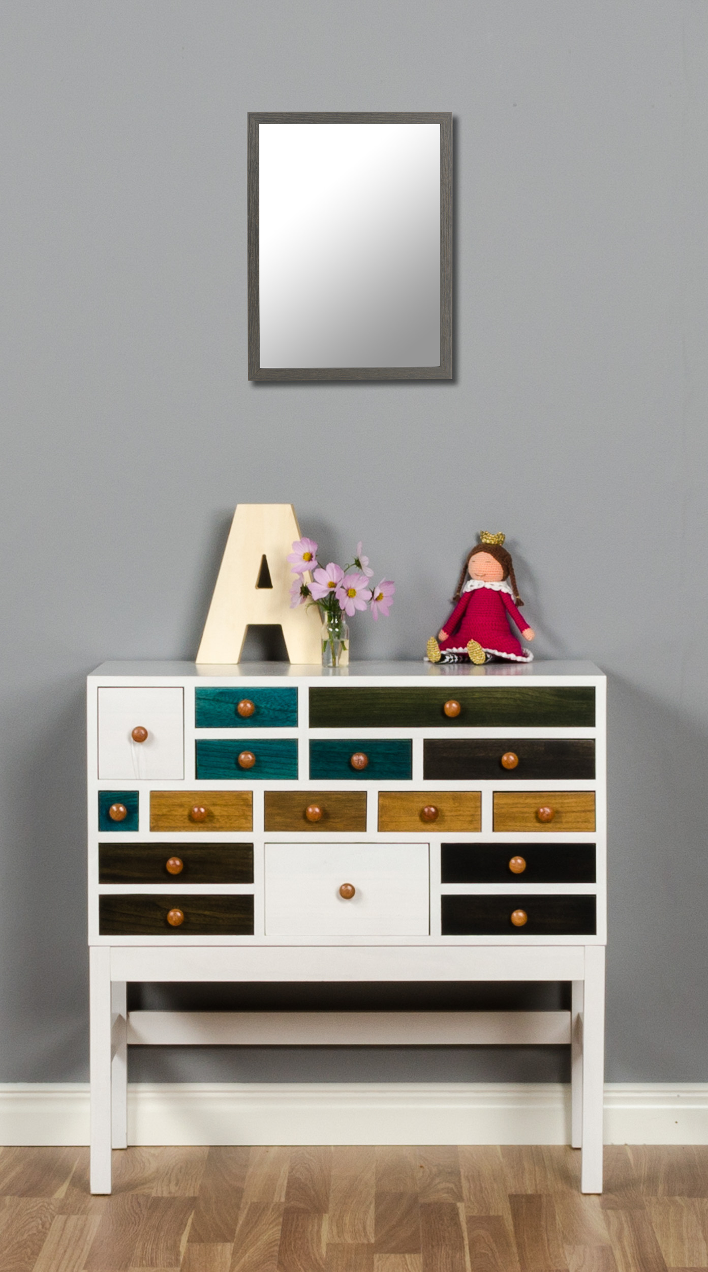 This mirror elevates and is a beautiful detail on your wall. This stylish mirror comes in grey, so looks particularly good with wallpaper, textiles and other furniture and accessories in black, white and other shades of grey. The paint on the frame is semi-opaque, so the texture of the wood shows through, giving the mirror a pleasant natural look. As the mirror is made to your specifications, you get it in a size and shape that fits you and your home perfectly!