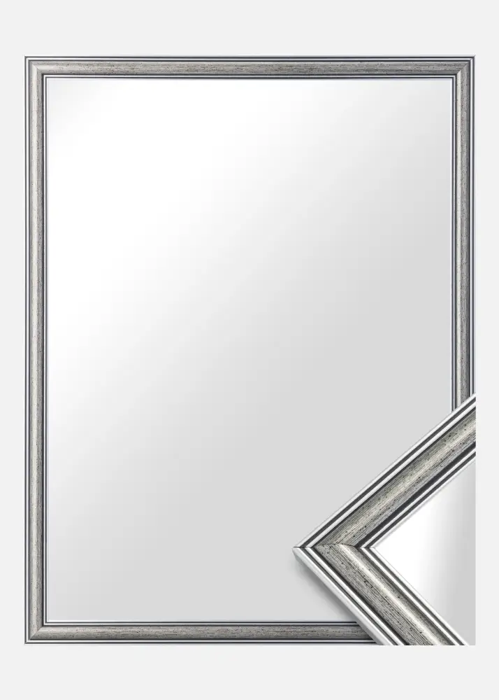 Start the frame selector »Frigg is a silver frame with black lines and black speckles. Perfect when you're looking for a traditional silver frame for your mirror.