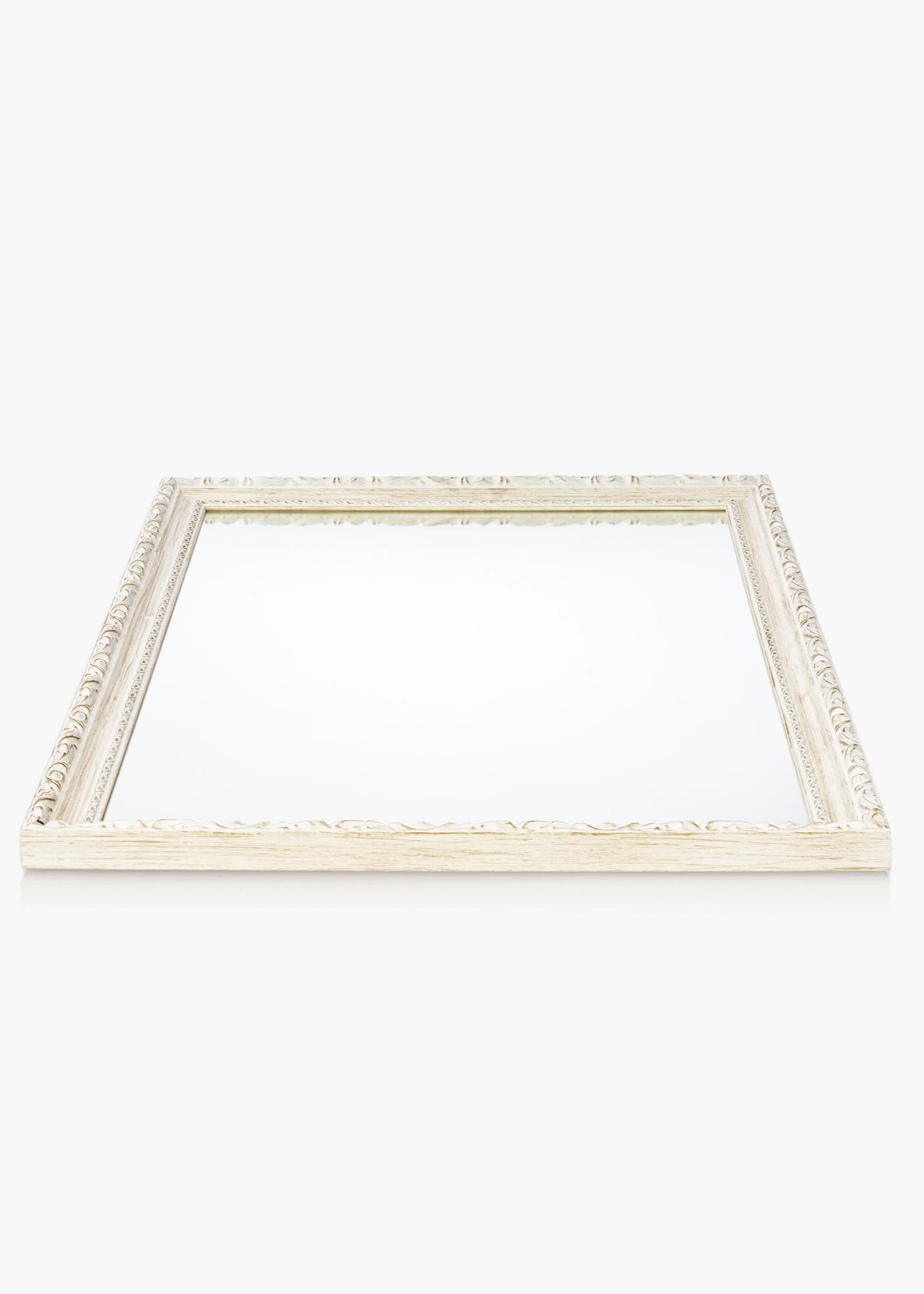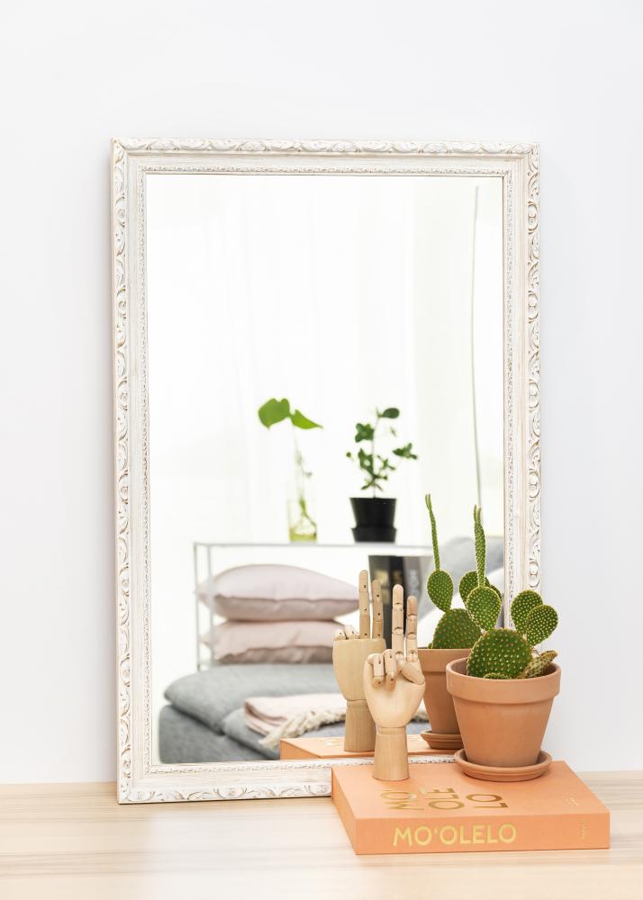 Sku:A white mirror in an antique style with a visible wooden texture and a width of 40 mm. An excellent choice if you're looking for a mirror that stands out and gets itself noticed.