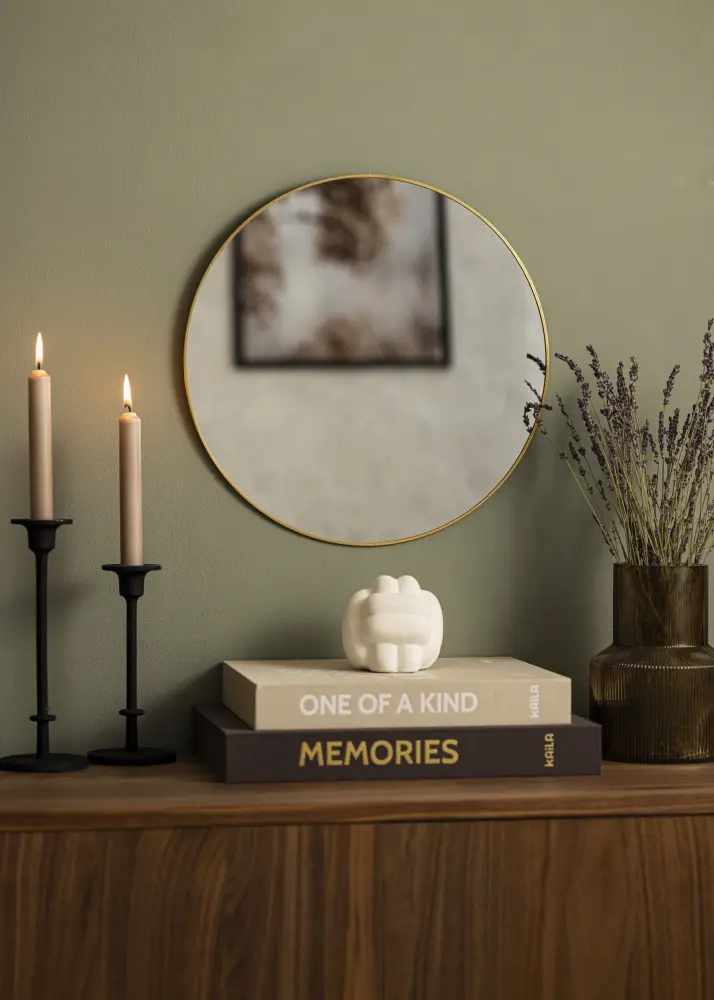 KAILA Thin Brass is a round wall-mirror with a thin brass-coloured metal frame. This mirror is more than just functional – it's also a beautiful decorative detail. Put it on the wall in any room to give it a luxurious and welcoming atmosphere. This mirror has wall fixings. It looks just as good alone on the wall as it does together in an elegant ensemble with other decorative details.