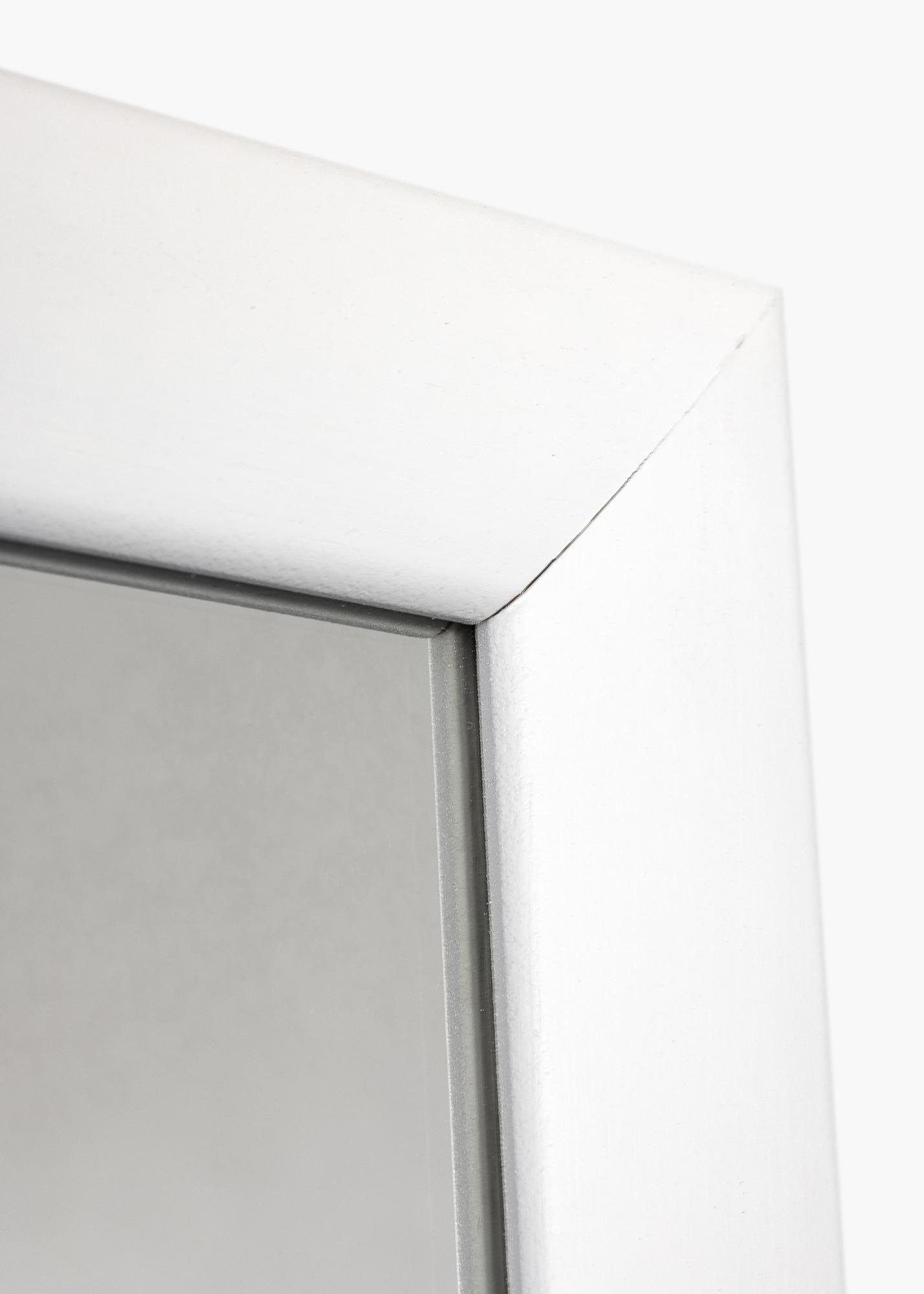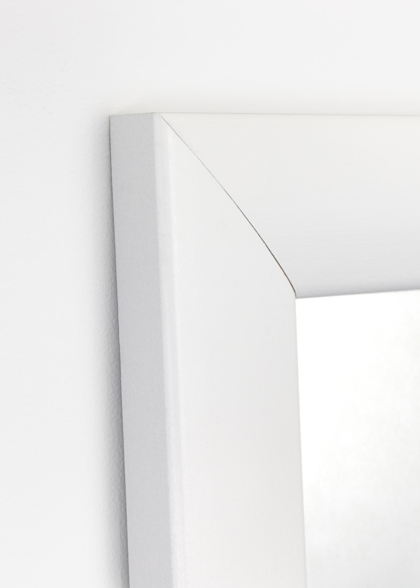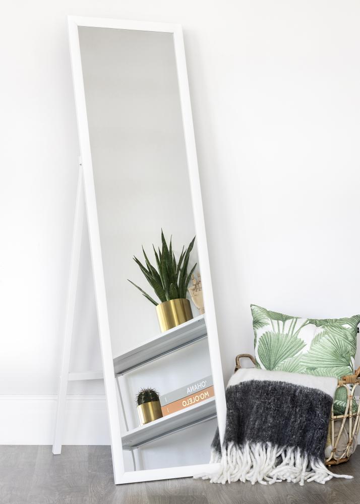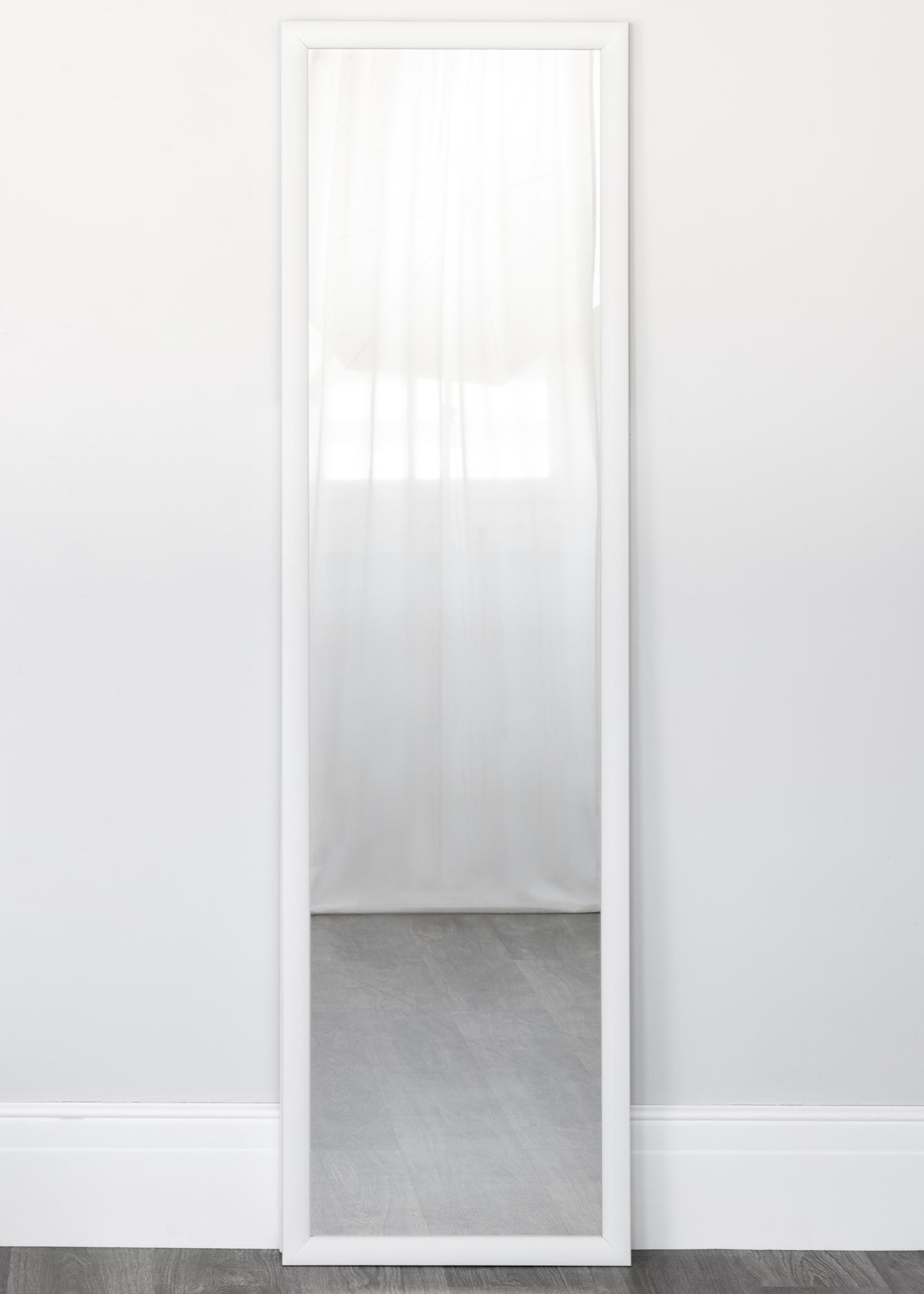White wooden floor mirror that fits perfectly in spaces where a full-body mirror is needed but you just don't have the wall space. The mirror's stylish appearance and colour mean it fits into rooms of all interior design types and colour schemes. It's nice to place in a walk-in closet with slightly more floor space or in your bedroom, where it also gives you somewhere to store your clothes. This is a practical mirror that's easy to move around when you need to.