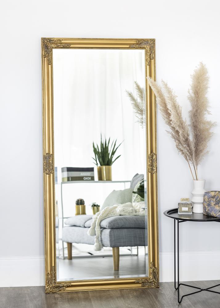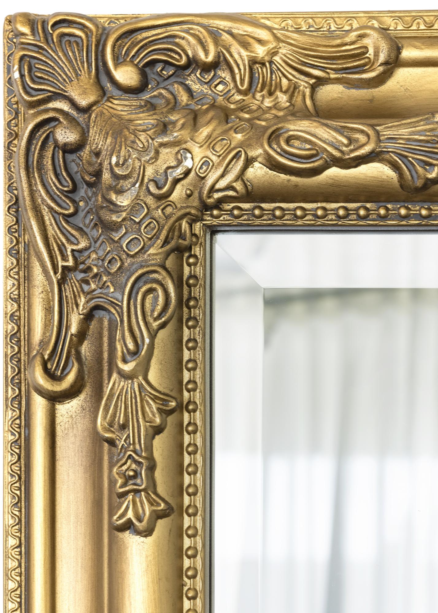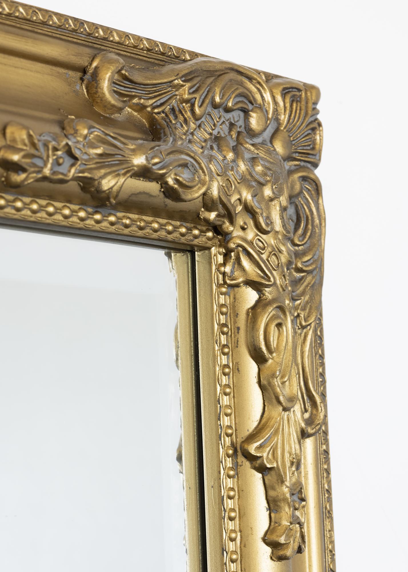 A mirror with a beautiful design that comes in gold, is decorated with floral details, and has an antique feel. The mirror frame's classic style means it looks good in rooms with older furniture, but it can also be used to create an interesting contrast in a stylish contemporary interior. The mirror is great for hanging in the hallway, the bedroom, or a walk in closet, and stands out beautifully when matched with accessories in brass or gold.