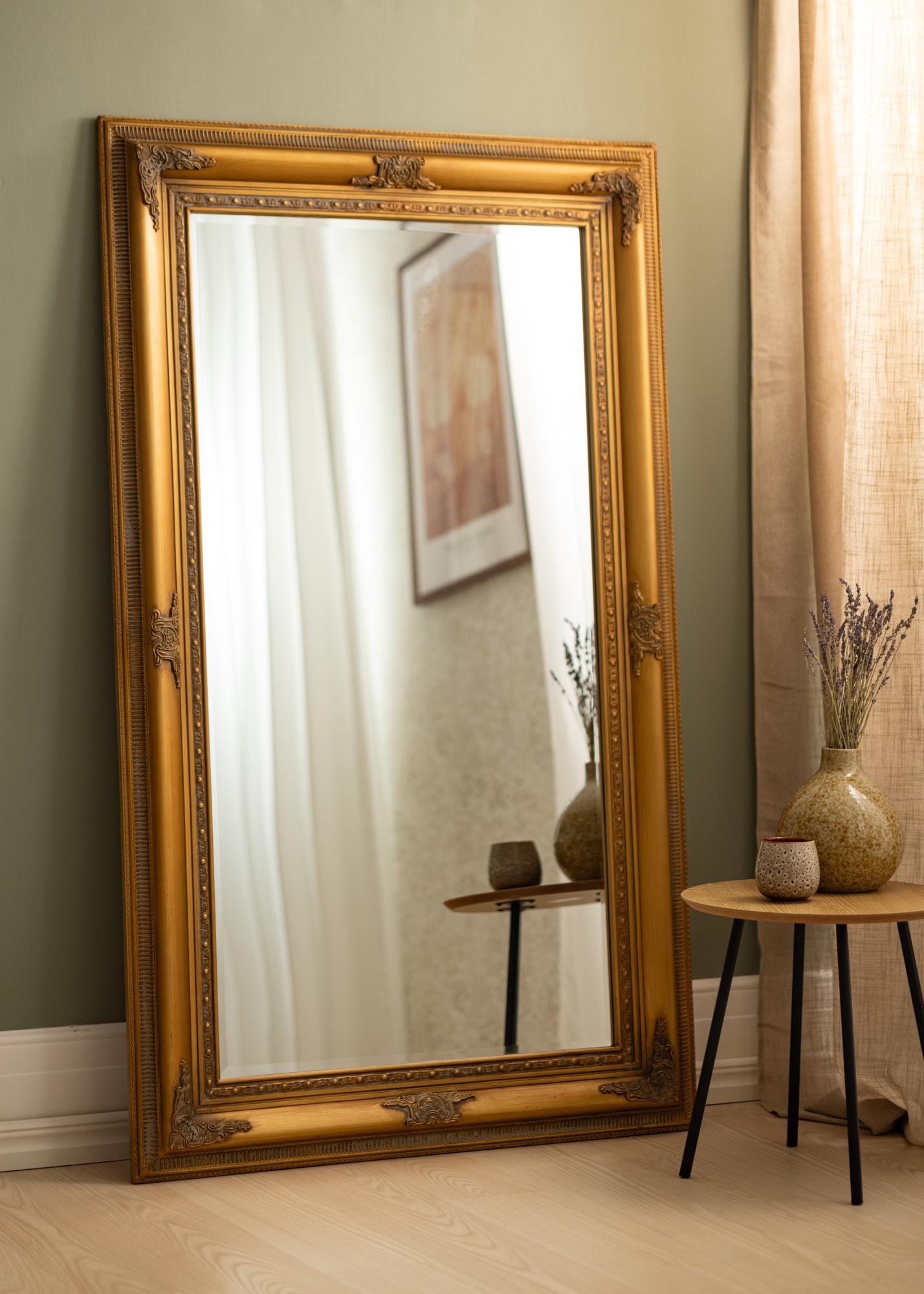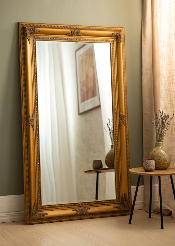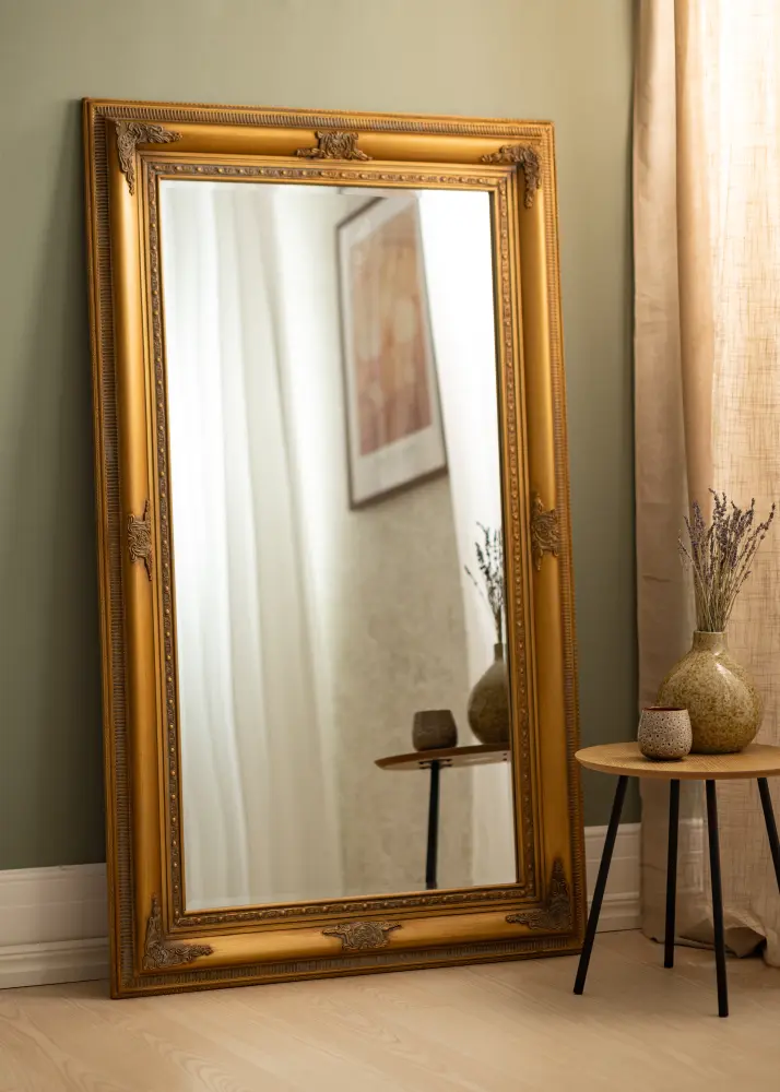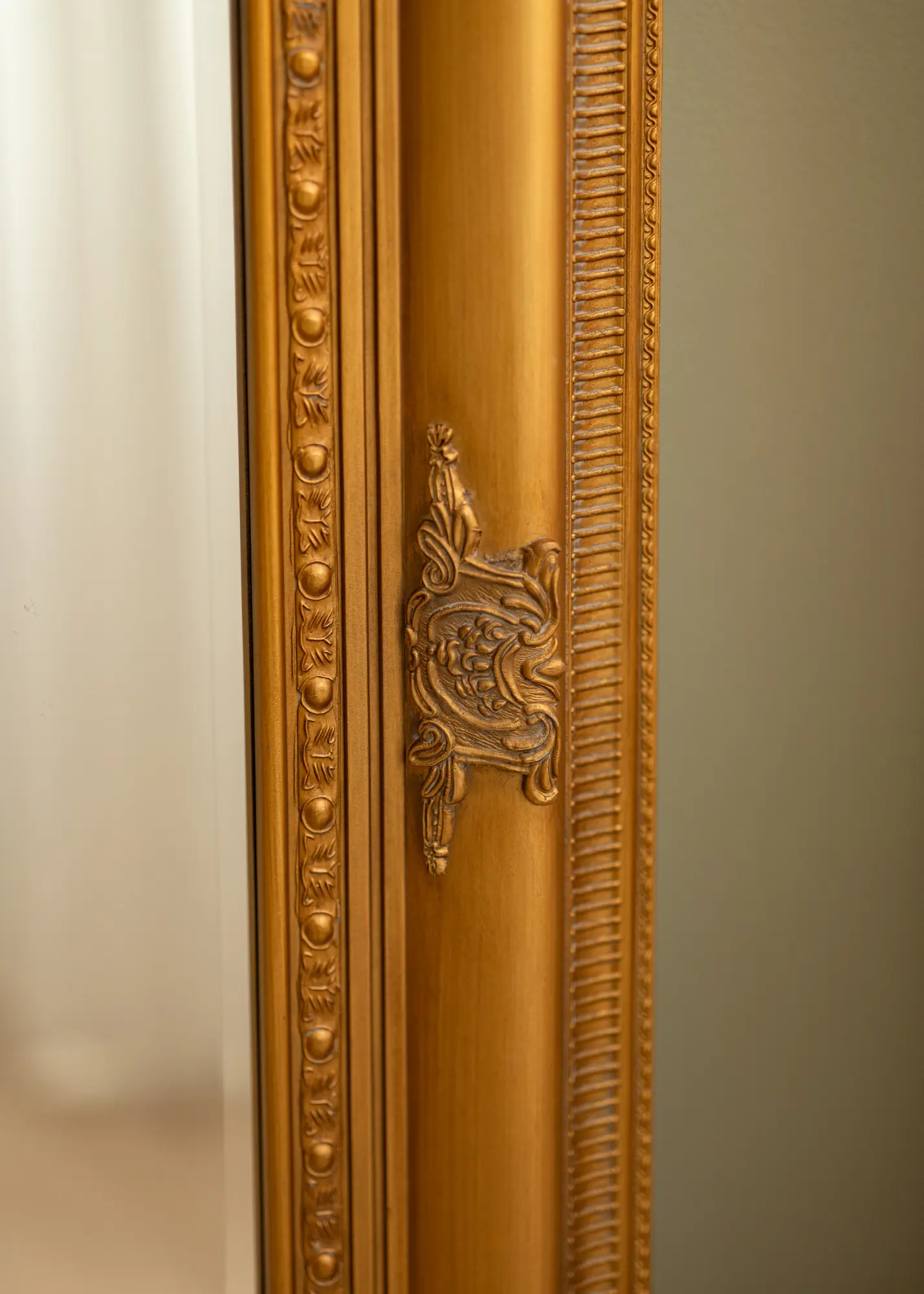 A mirror with a beautiful design that comes in gold, is decorated with floral details, and has an antique feel. The mirror frame's classic style means it looks good in rooms with older furniture, but it can also be used to create an interesting contrast in a stylish contemporary interior. The mirror is great for hanging in the hallway, the bedroom, or a walk in closet, and stands out beautifully when matched with accessories in brass or gold.
