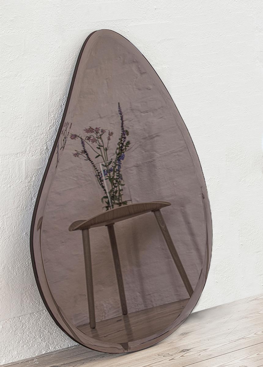 This is a teardrop-shaped mirror with tinted mirror glass in bronze. The colour creates a beautiful effect in the room you hang it in. It fits anywhere in a trendy home.