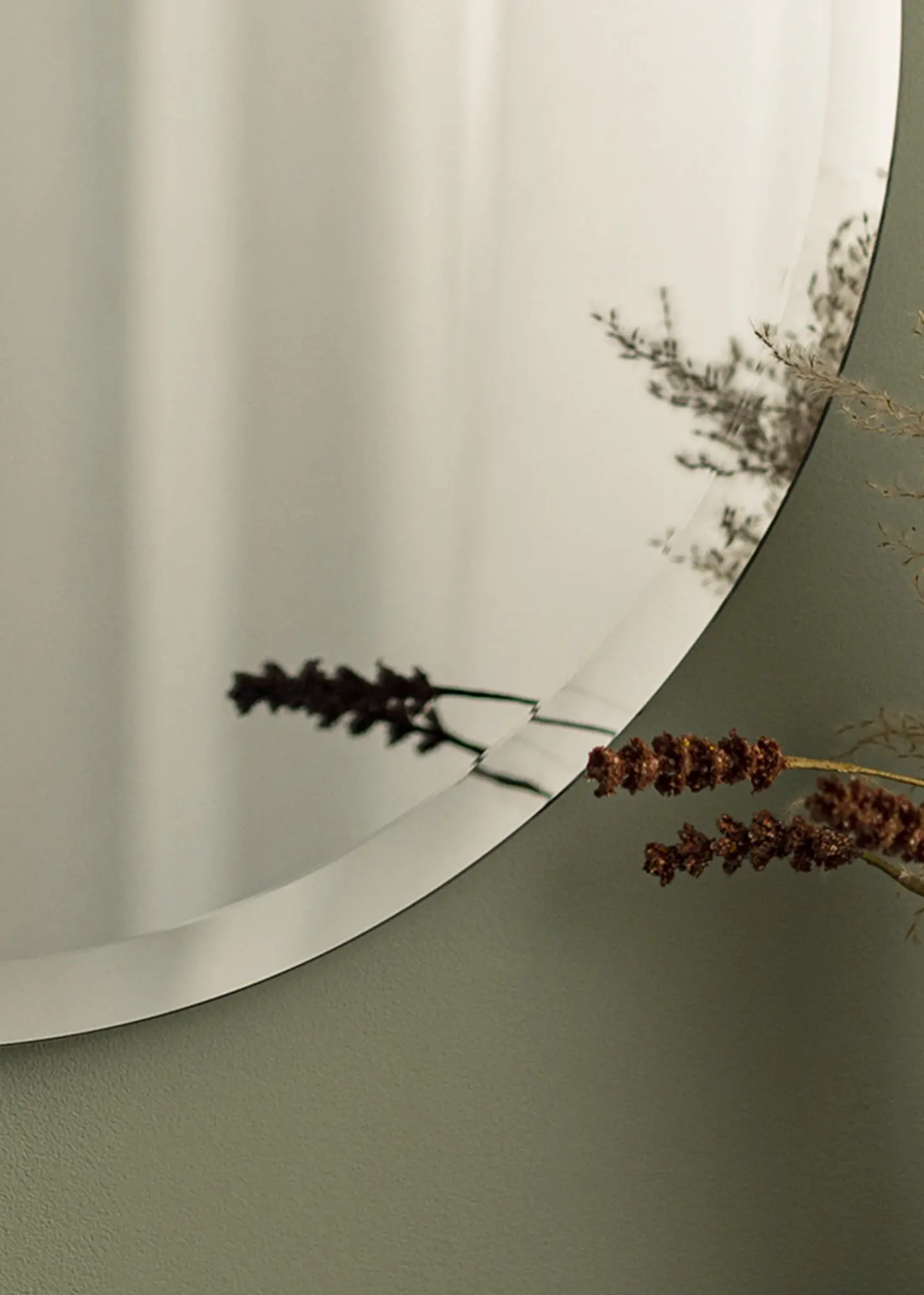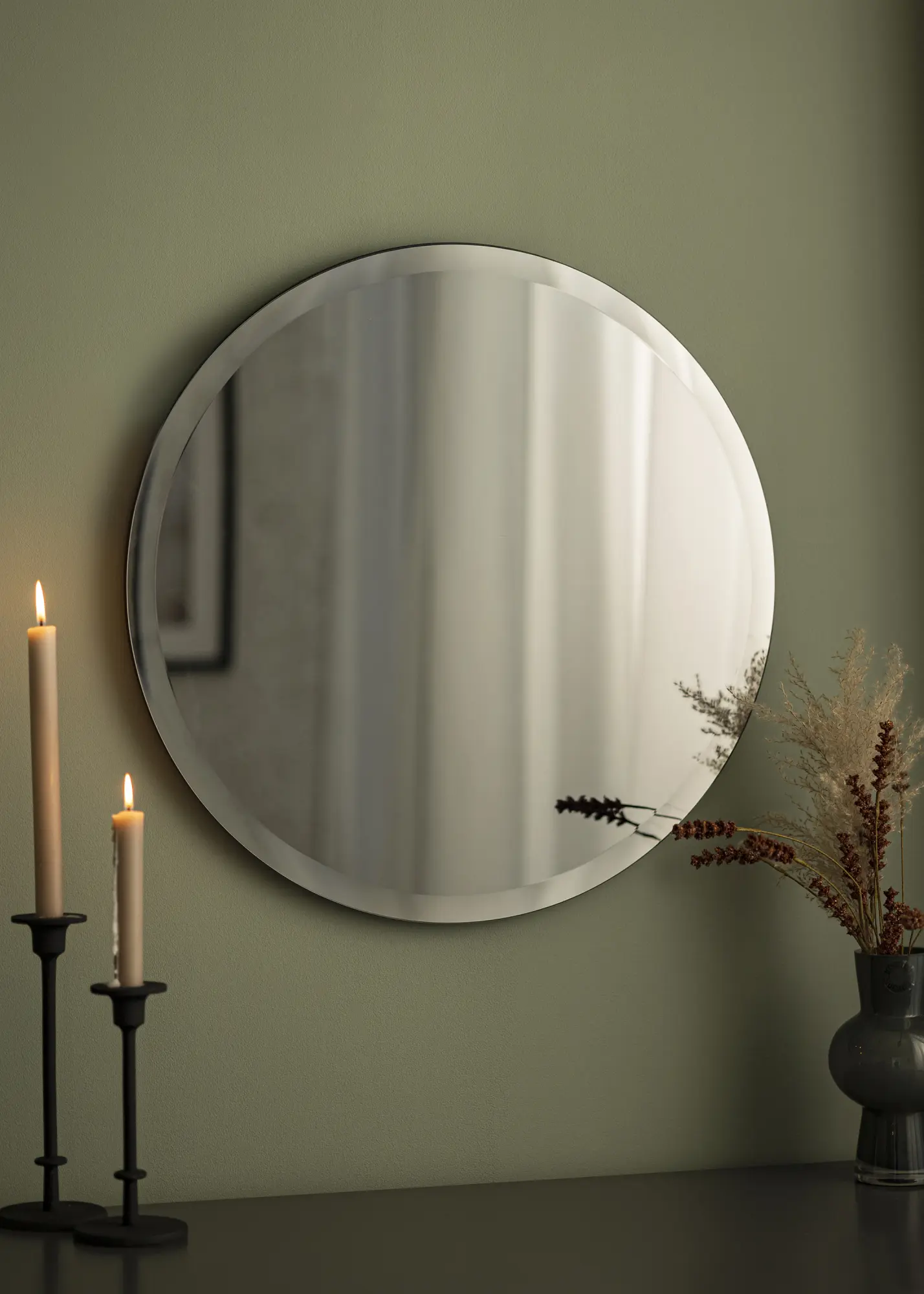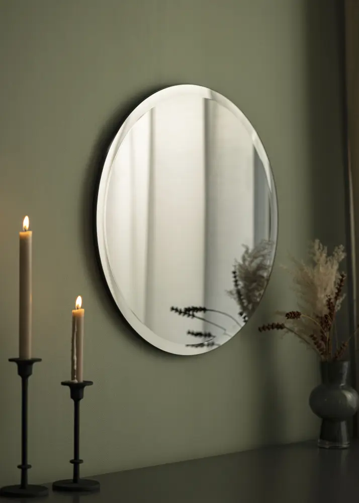 This is a round mirror with mirror glass in a fantastic, warm grey colour. Danish brand Incado is behind the mirror's design, and its bevelled edge gives it more than a touch of luxury.