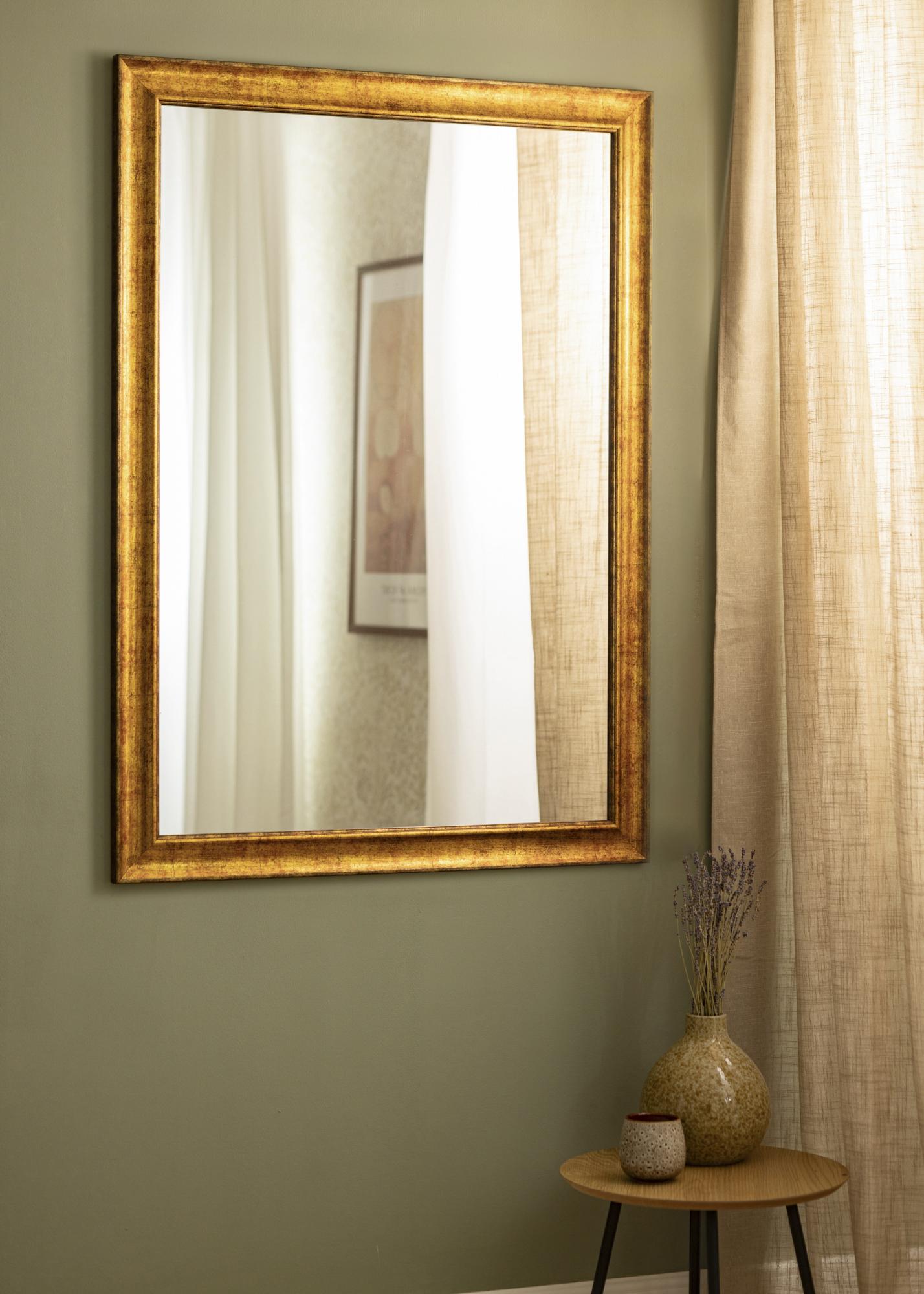 This beautiful wall mirror has a decorative gold frame made from composite. The frame has an elegant "distressed" finish that gives the mirror an antique look perfect for homes with a warm, cosy style. The practical wall bracket on the back allows you to hang your mirror in both portrait and landscape format. The mirror measures 70x100 cm.