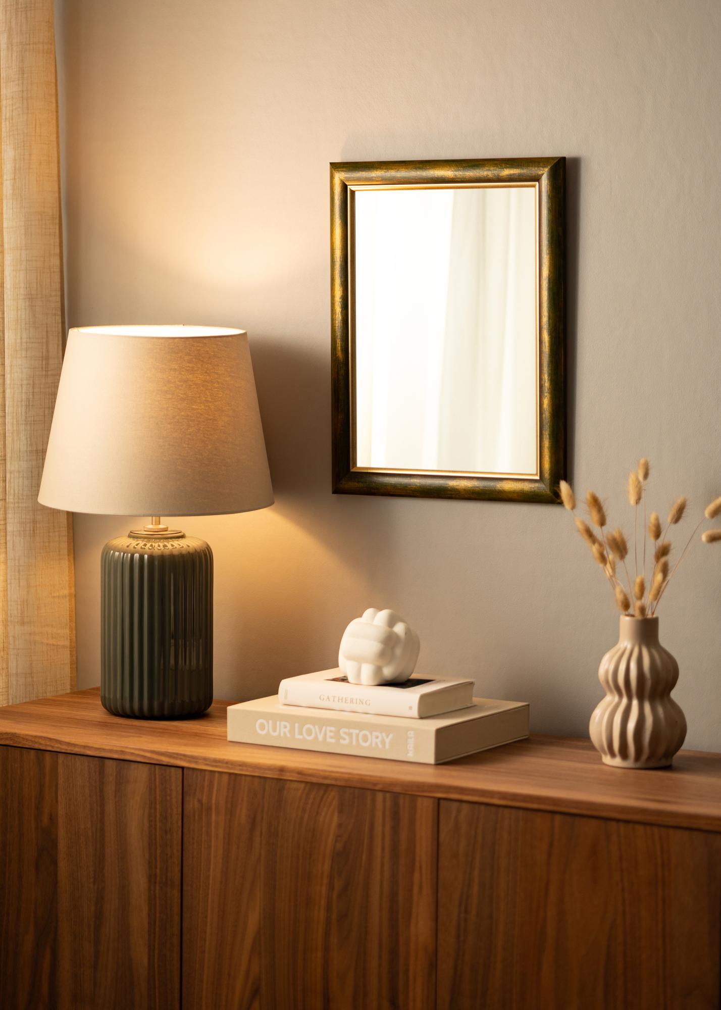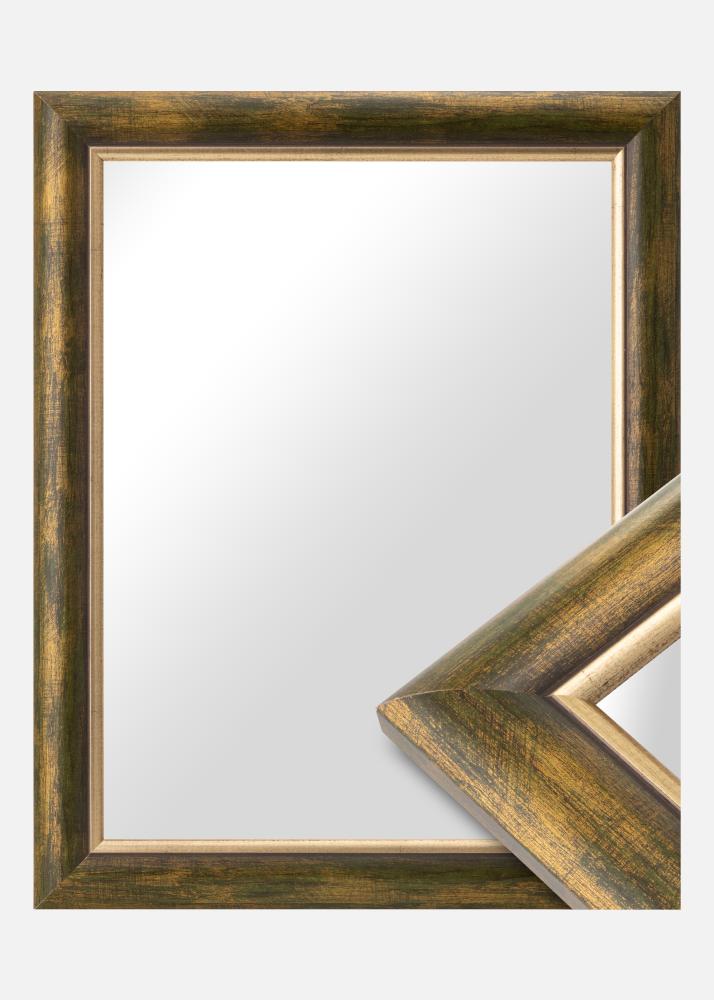 Timeless wooden frame made in Finland with a nice green wooden surface and a gold edge around the mirror glass. The frame is 41 mm wide and, at 19 mm, extra deep.
