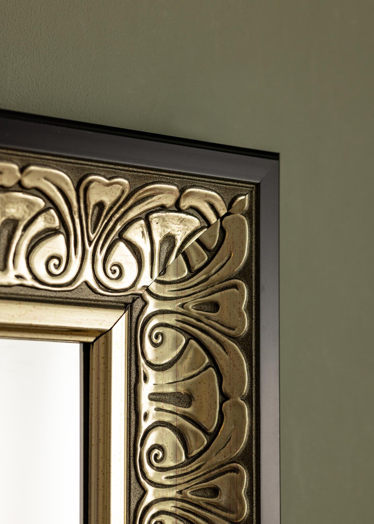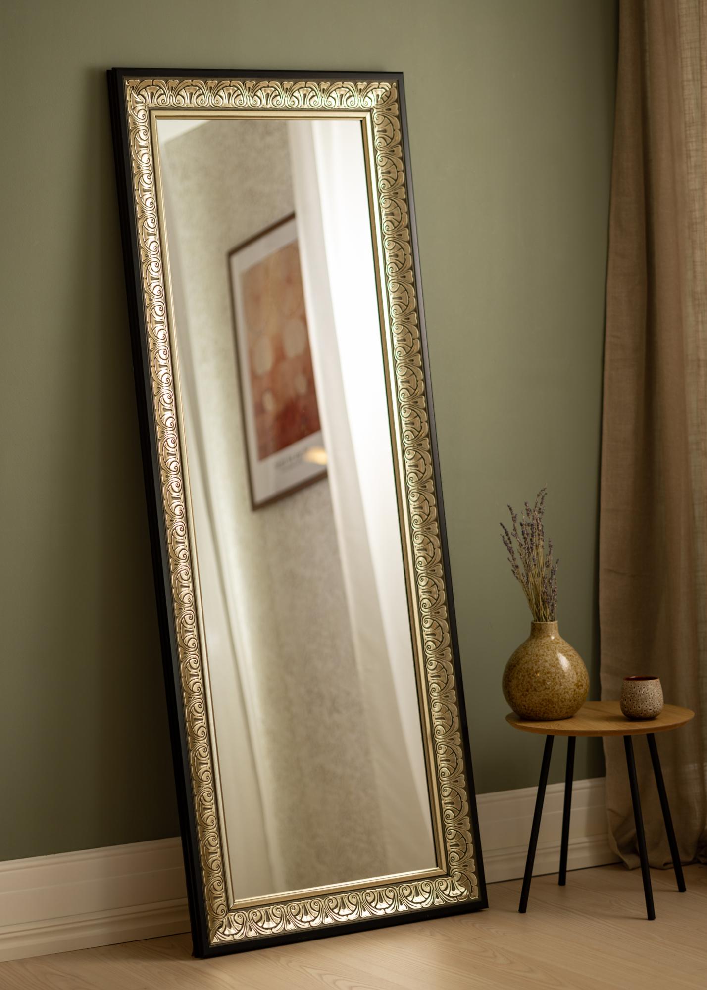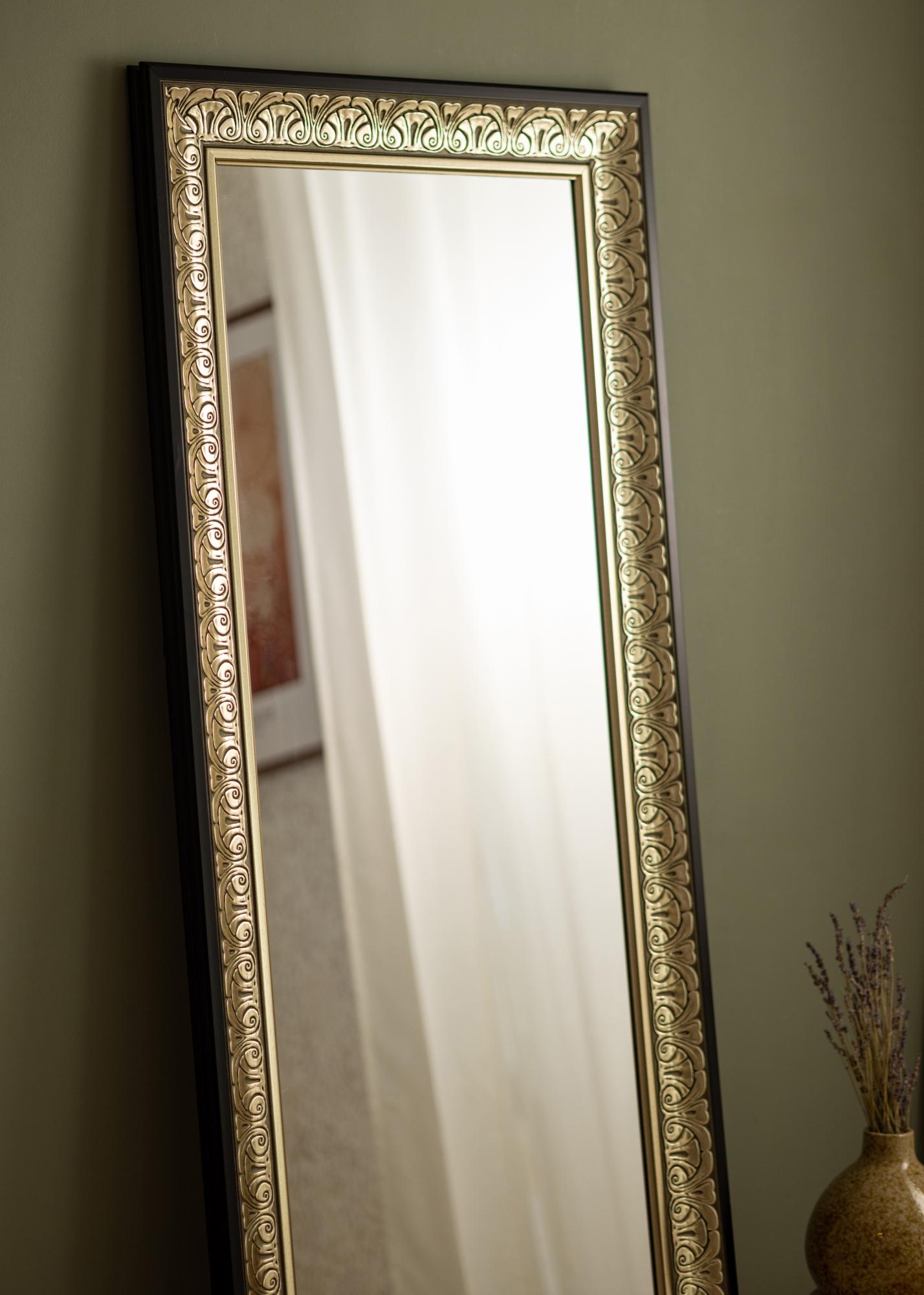 A stylish, ornamented silvermirror that looks just as good in a walk-in closet as in a hallway or bathroom. The mirror frame's timeless pattern makes the mirror work well with all types of interior design styles, from romantic, pastel-coloured, feminine bedrooms to more stylish and minimalistic spaces, where the mirror can be used to create contrast. Thanks to its height and elegant design, it also functions beautifully as a full length mirror – ideal for adding both practicality and charm to your space. The mirror looks great hung above a sideboard or buffet table, where it makes the room feel bigger.