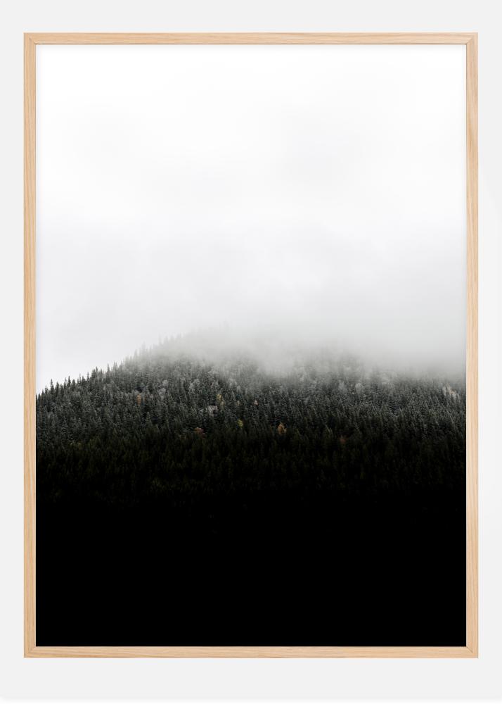 A tranquil nature photograph of a forest-covered mountain peak resting under dense fog. A calm and harmonious poster with sharp contrasts and soft lines. Feel free to combine with several of our fantastic motifs on a larger picture wall.