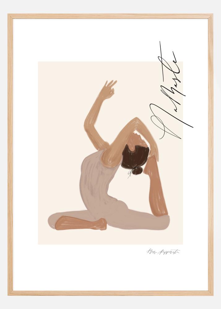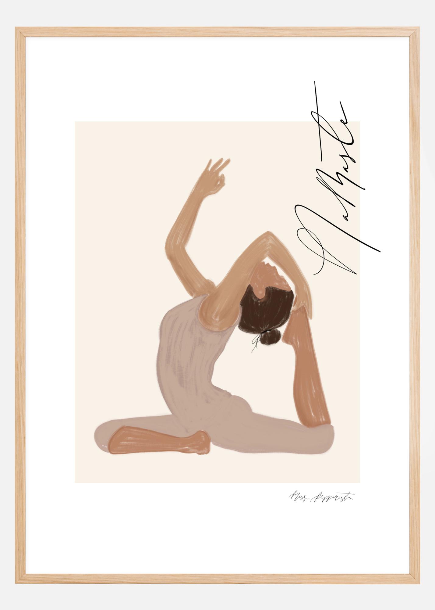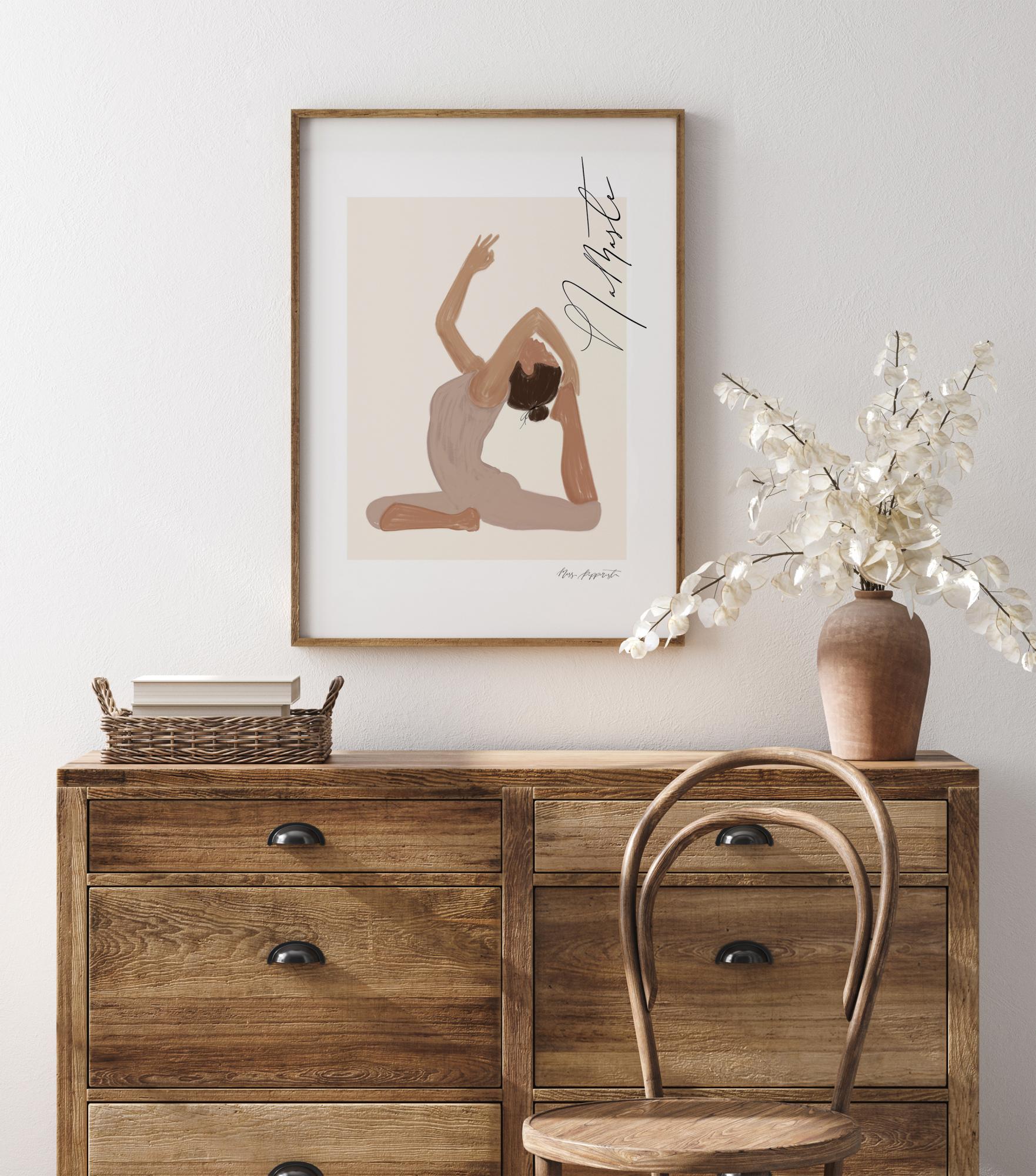A graphic poster in soft pastels, depicting a woman in a yoga pose along with the message "Namaste" (I bow to you) in beautiful calligraphy. A harmonious and tranquil motif that has been framed and highlighted with a wider white mat, created by Jenny Skantz, Miss Papperista.