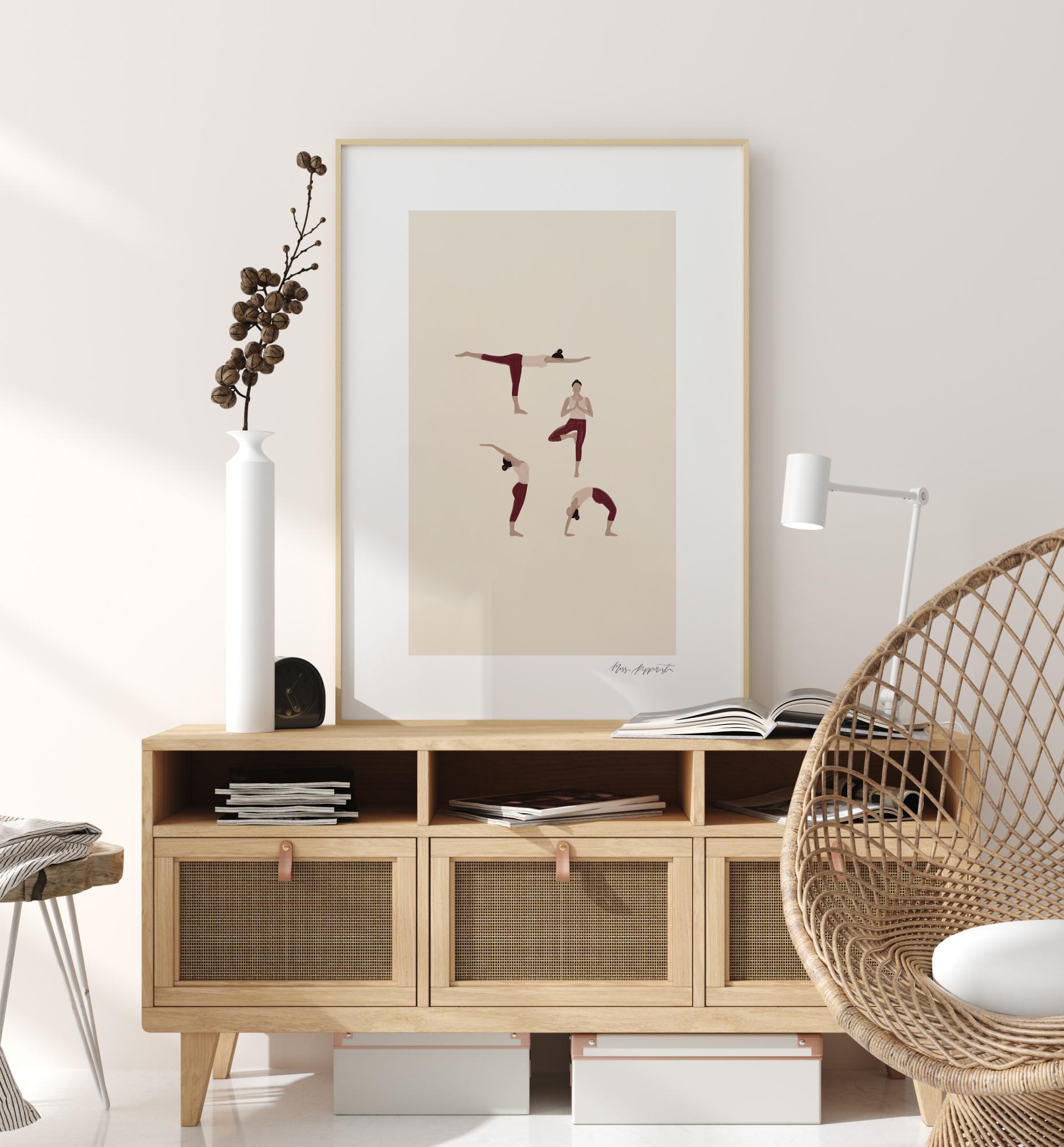 An informative poster in fine pastels illustrating four different yoga poses. A simple and sleek print, created by Miss Papperista. Feel free to match with Miss Papperista's Namaste and Namaste II for a collage in the same theme.