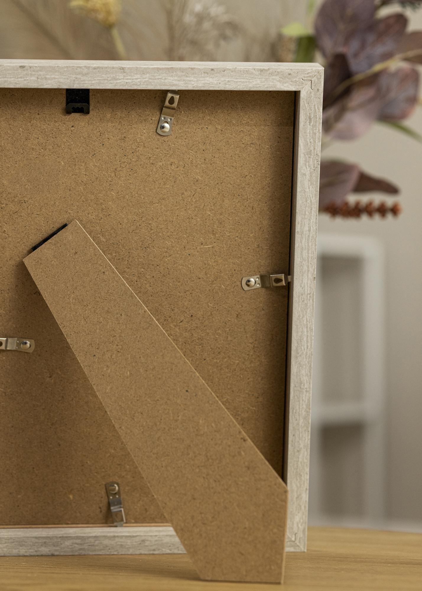 This picture frame is made from MDF and is coated in a matt grey veneer with a beautiful wood effect. The frame is fitted with real glass. Pictures and mounts can be inserted via the back of the frame. Just twist the metal clips that hold the back panel in position and place your image inside.