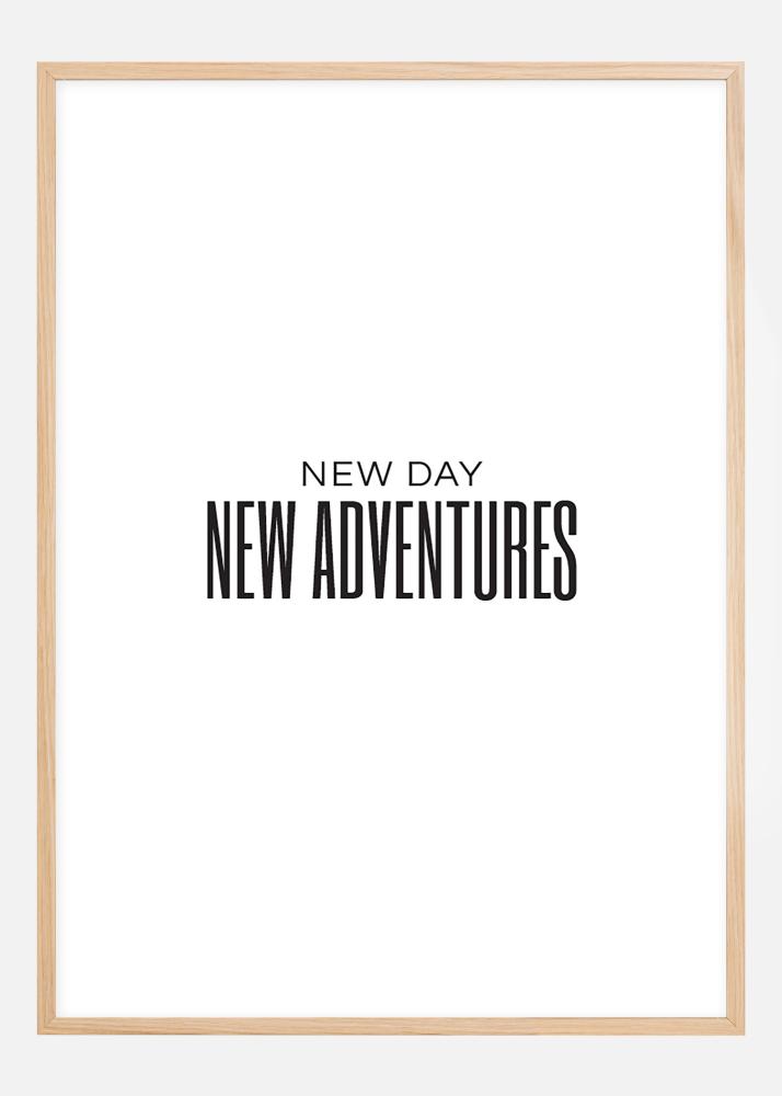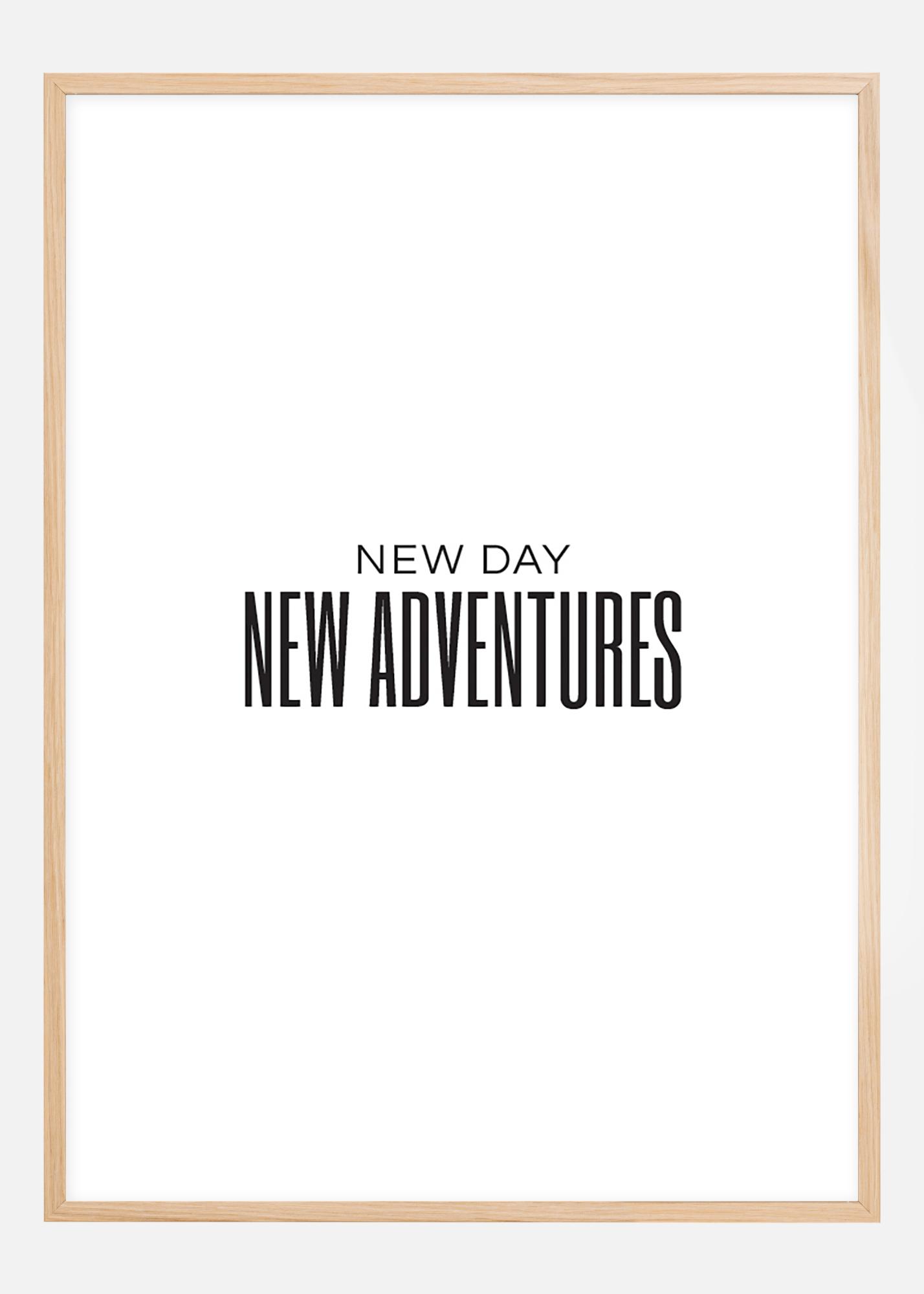 A simple and sleek poster with large capital letters and the message "New day, New adventures". Text posters are perfect additions to larger collages and picture walls. Feel free to complement with something from our large assortment of picture frames.