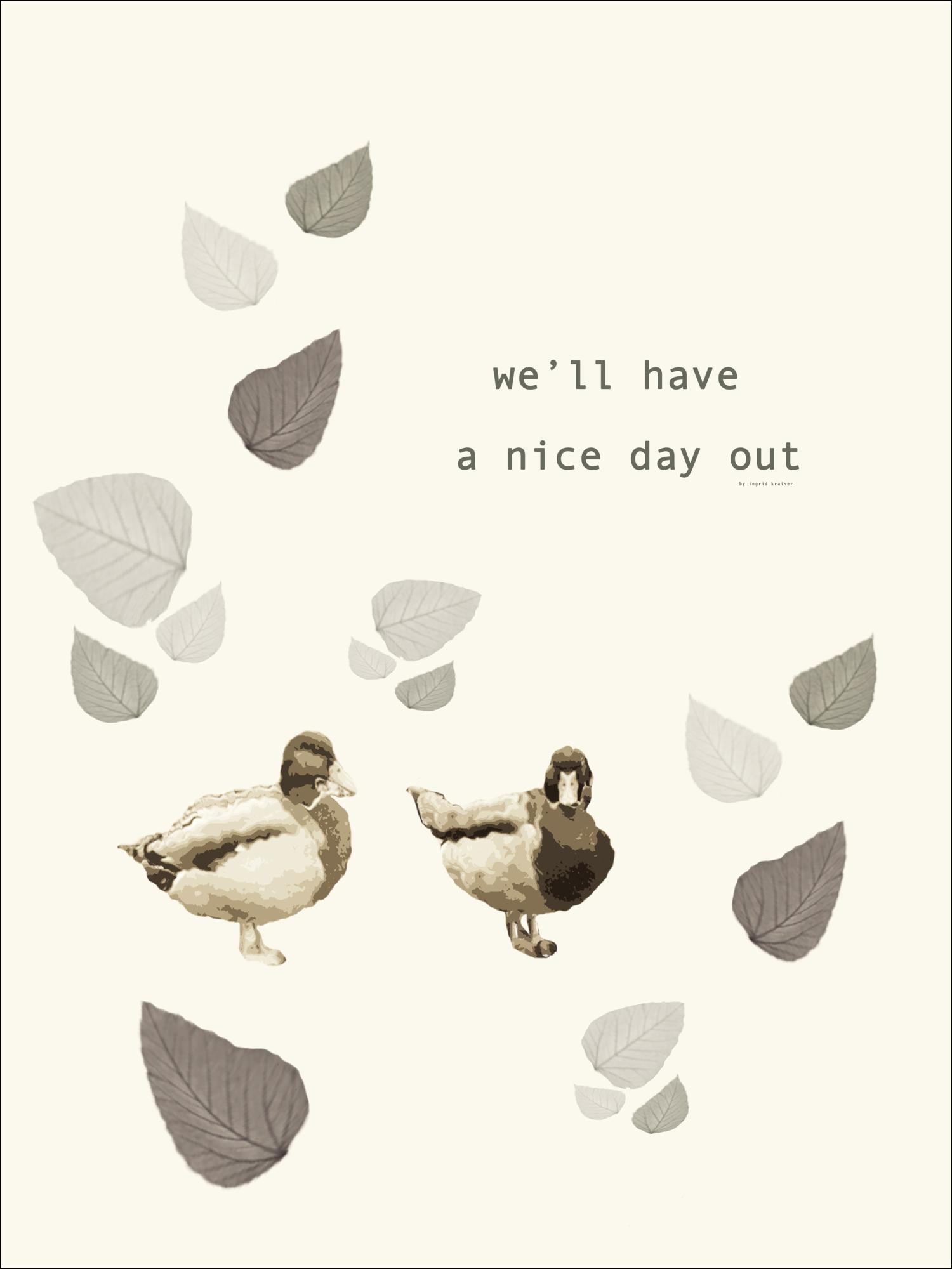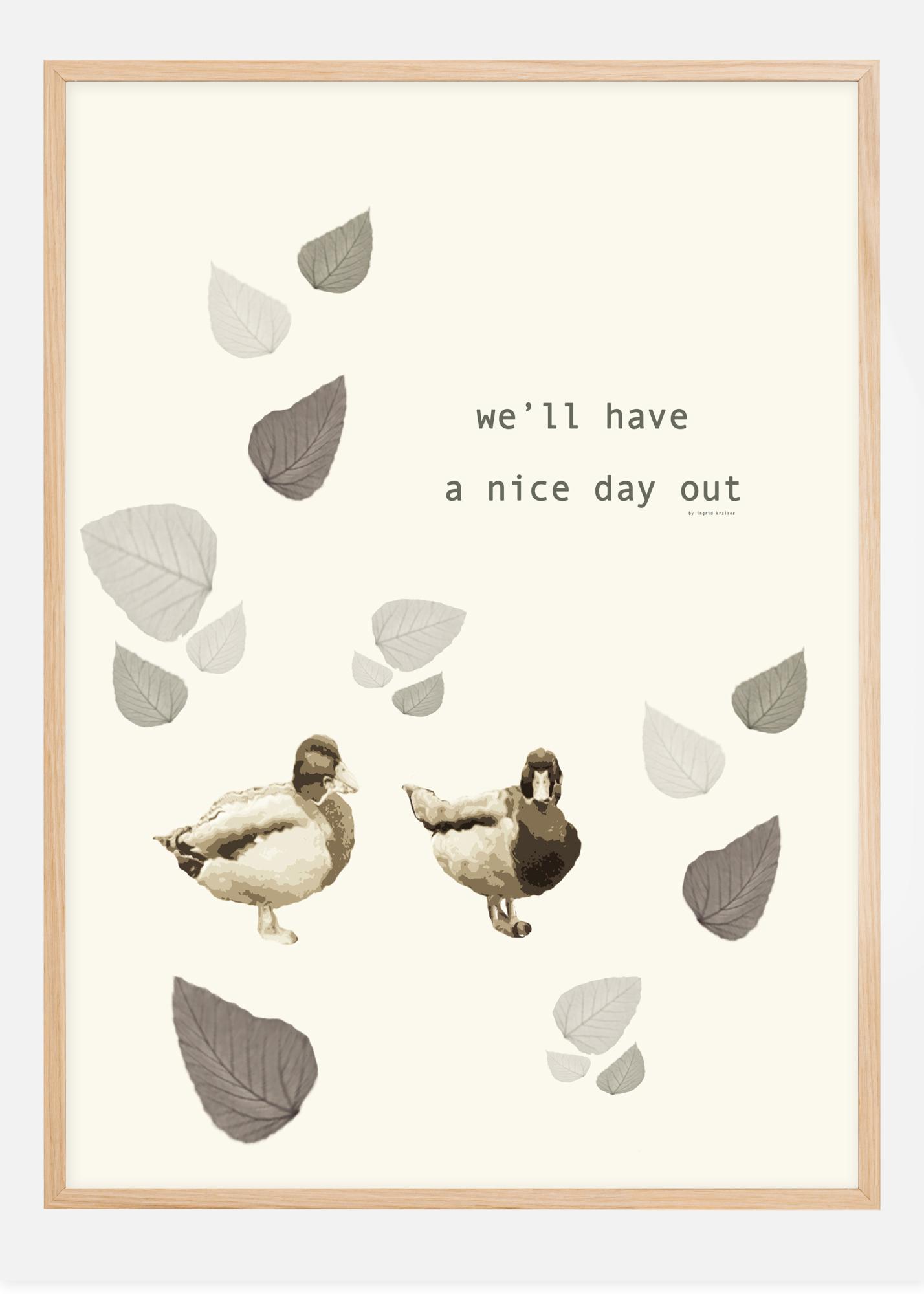 An black and white poster of two birds, clustered leaves and the phrase "we'll have a nice day out" drawn perfectly on a white surface. The leaves and the birds blend perfectly together with their soft beige tones. The perfect print for those who love birds.