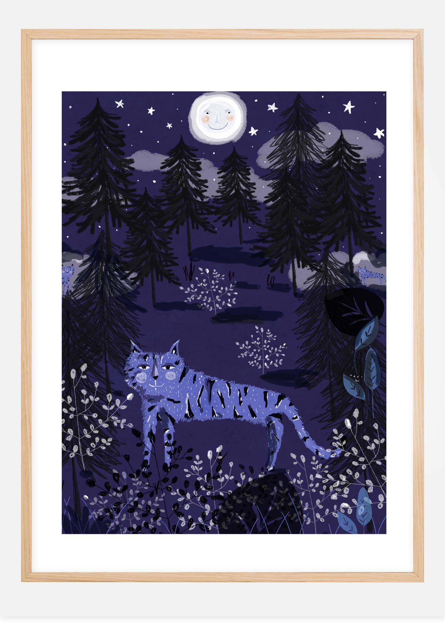 A fun print of a forest at night with a smiling moon and tiger. The purple sky is filled with clouds and glittering stars. In the background, the pine tress stand tall while the moon looks down on them. The dark mauves and greens create a warm feeling, while the small white bushes add that extra bit of light to the print. A perfect print for your child's room.