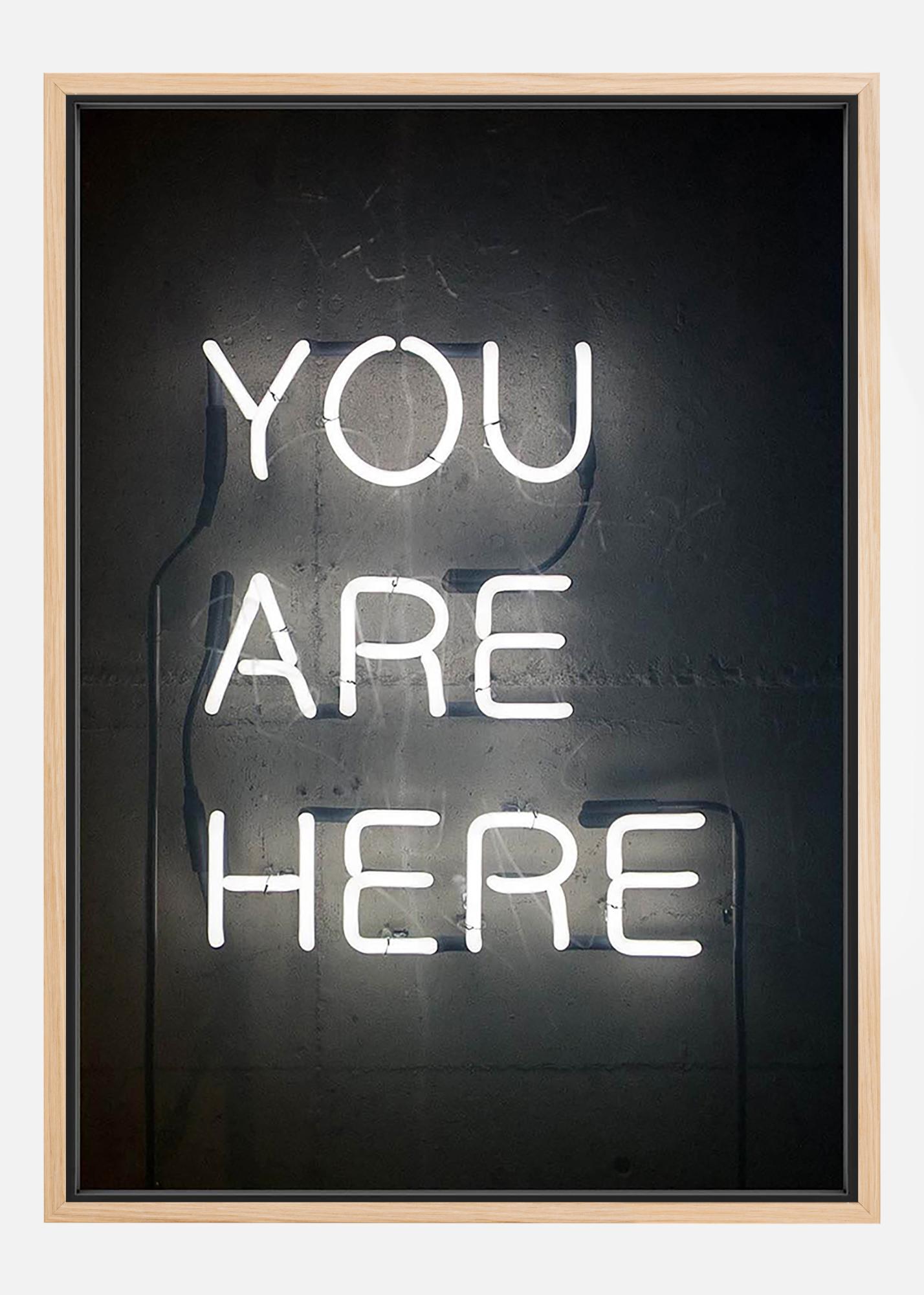 A black and white text poster of a neon sign with the informative text "You are here". A simple and sleek painting with a pleasant humorous element, perfect to combine with other of our fantastic motifs on a larger picture wall.