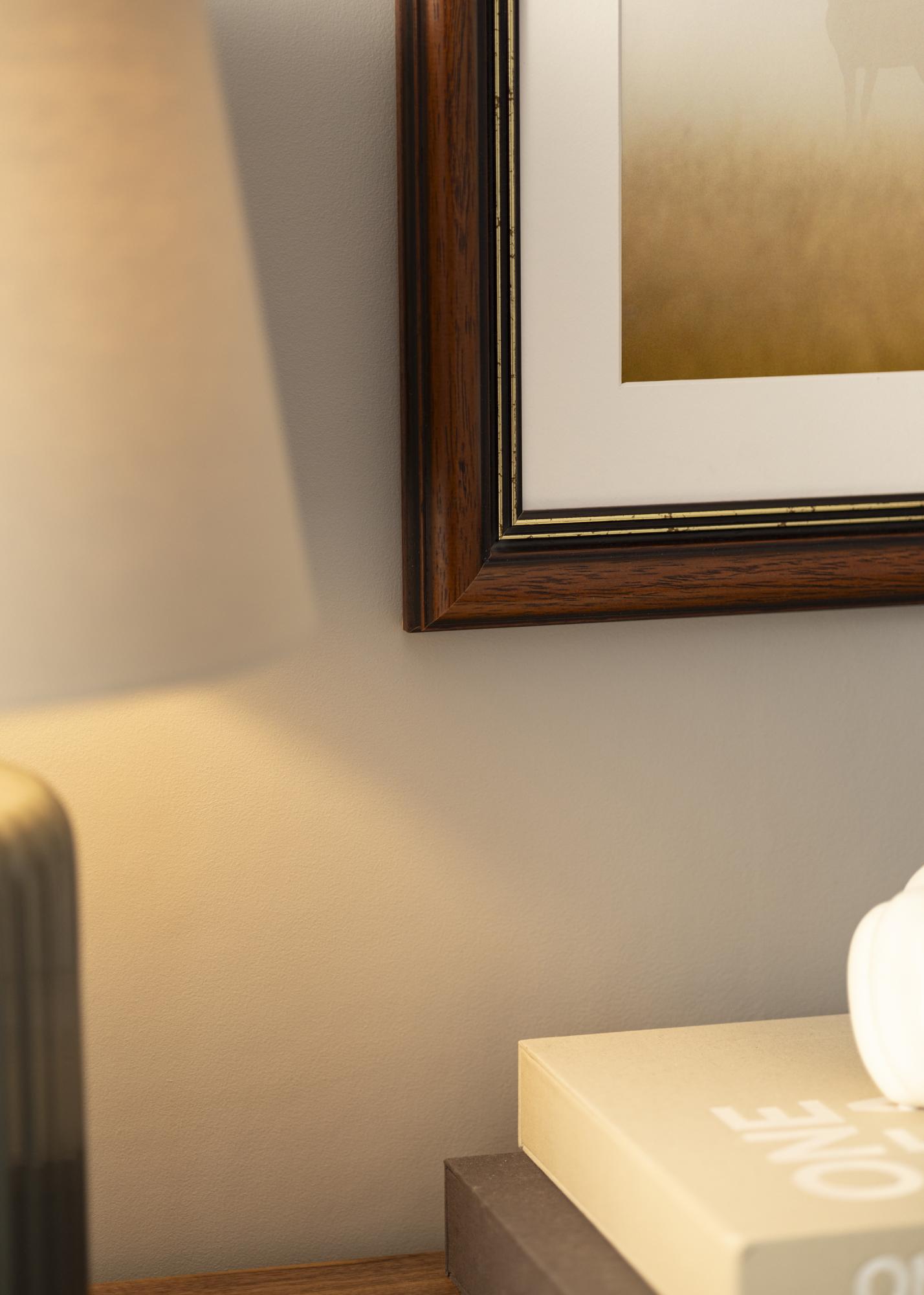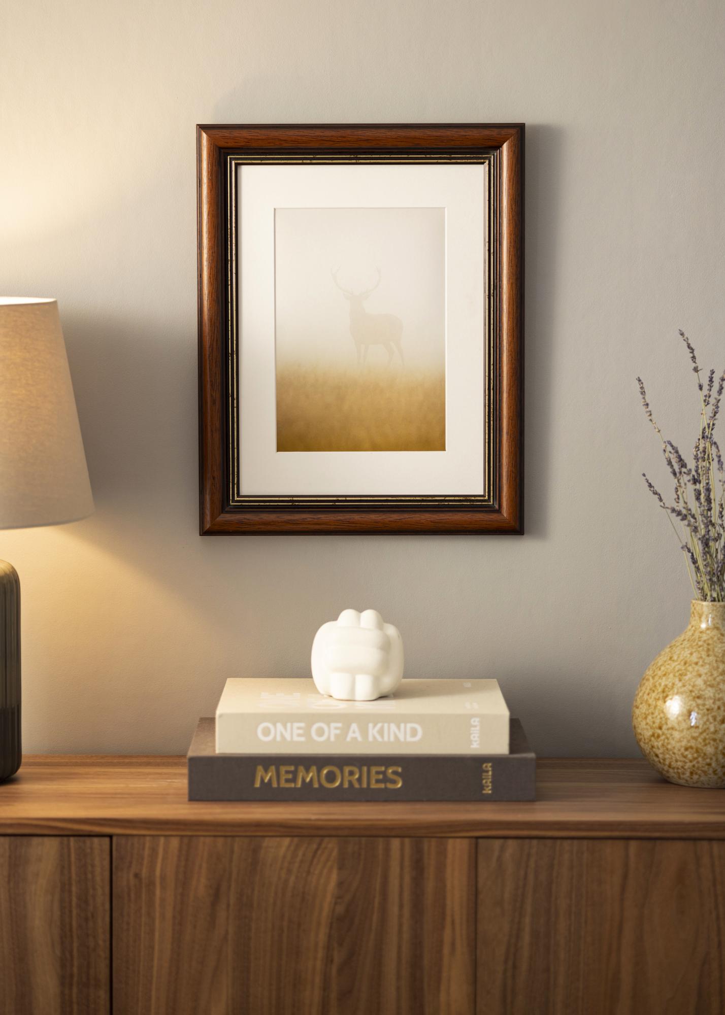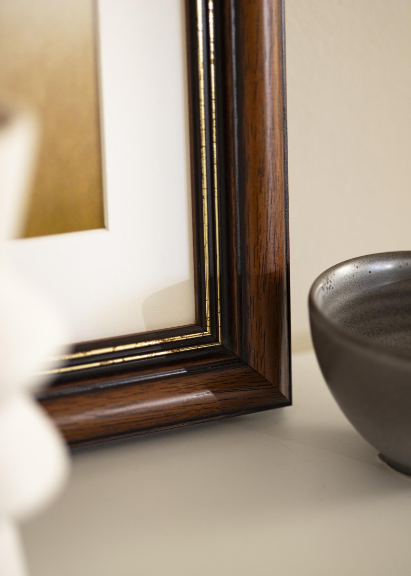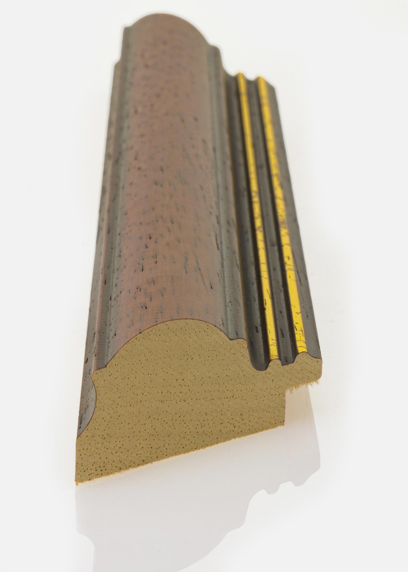 Orsa is a frame in a classic style with a wide, rounded profile. The base colour of the picture frame is brown, with black elements combined with two gold-coloured lines, next to the image.