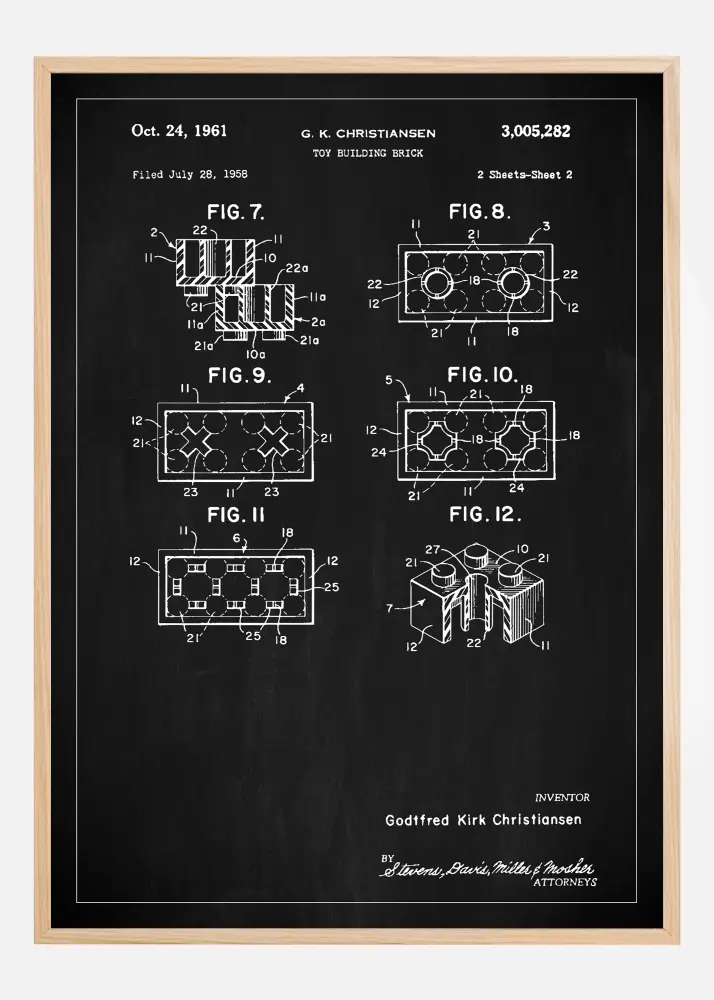 This patent poster is a tribute to one of the most iconic inventions in the toy world, created by the inventor Godtfred Kirk Christiansen. With patent number 3,005,282, granted on October 24, 1961, this poster displays the detailed construction drawings of the classic toy building brick from LEGO. It is a fantastic representation of the history and design of toys that unites generations of creative builders.