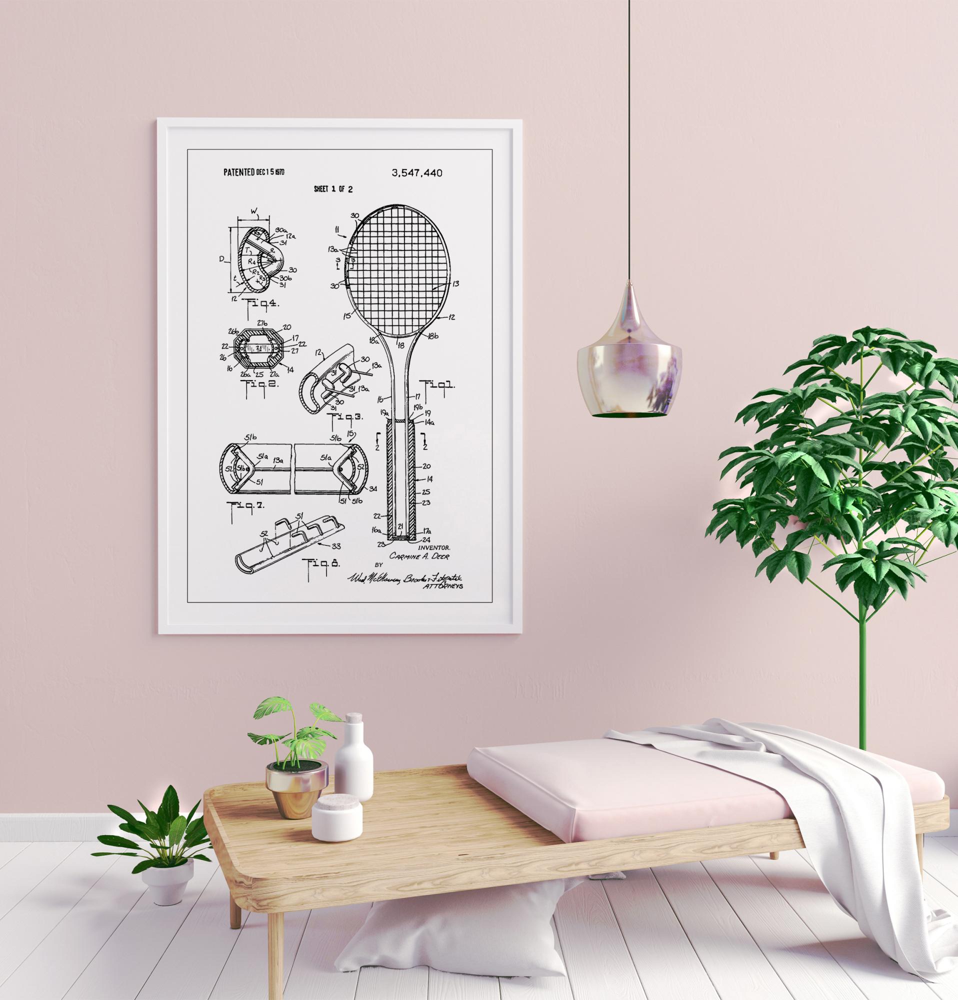 This patent poster features a technical drawing from the historical U.S. Patent 3,547,440, granted on December 15, 1970, which presents the invention of a tennis racket. With its exact lines and detailed sketches of the racket’s various parts, from handle to stringing pattern, this poster is a true representation of engineering art and design finesse.