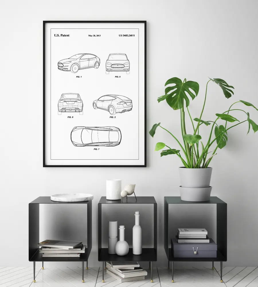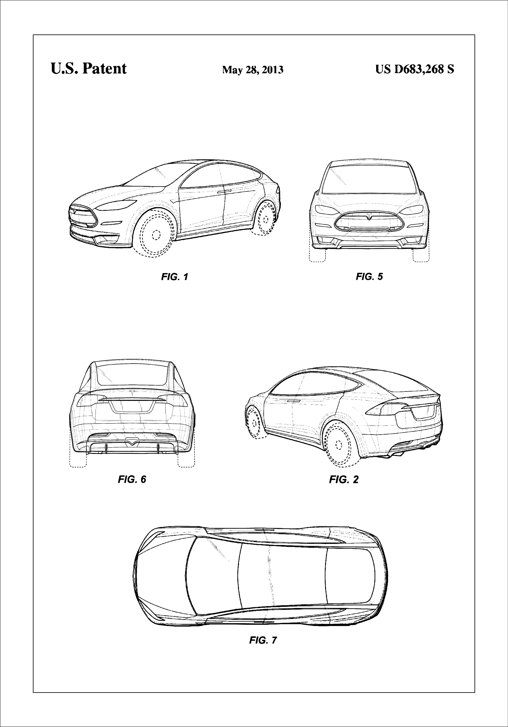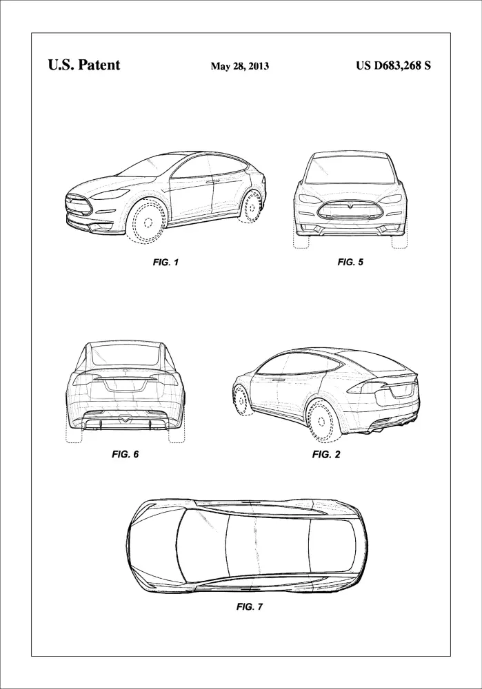 Discover a world of innovation and style with this distinctive patent poster of a Tesla, proudly showcasing patent number US D683,268 S, granted on May 28, 2013. This minimalist and sleek patent poster highlights a revolutionary vehicle design that represents the cutting edge of technology and industrial design. The poster captures the eye with its sharp lines and precise details, making it a standout interior piece in any modern home or office.