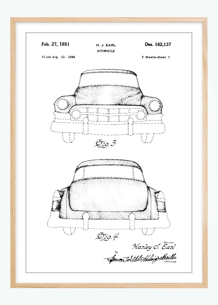 This stylish patent poster depicts an iconic Cadillac, a tribute to the 20th-century advancements in automotive engineering. Designed by H.J. Earl and patented on February 27, 1951, under number Des. 162,137, this patent drawing is a must-have for anyone who appreciates the aesthetics and design history of classic cars. The poster displays the vehicle in profile from the front and back, and the attention to detail in the illustrations evokes a sense of nostalgia and admiration.