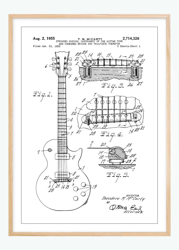 This patent poster shows a detailed drawing of a string musical instrument, specifically a guitar, which was documented by the inventor Theodore M. McCarty on August 2, 1955, under patent number 2,714,326. The drawing depicts the construction of the instrument with a combined bridge and tailpiece, an innovative design that contributed to the guitar's tone and playability. The different views provide insight into the mechanical and aesthetic aspects of the guitar's design.
