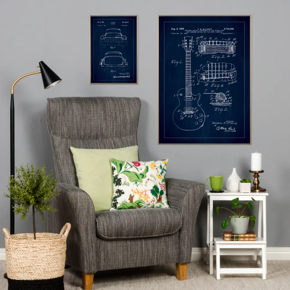 This patent drawing is an ideal decoration for musicians, music producers, and anyone with a passion for the history and design of music. It captures the essence of musical creativity and the craftsmanship behind the making of such iconic instruments. As a piece of wall art, this patent poster not only adds visual interest to the room but also serves as a tribute to the technological advancements that have shaped the sound of generations.