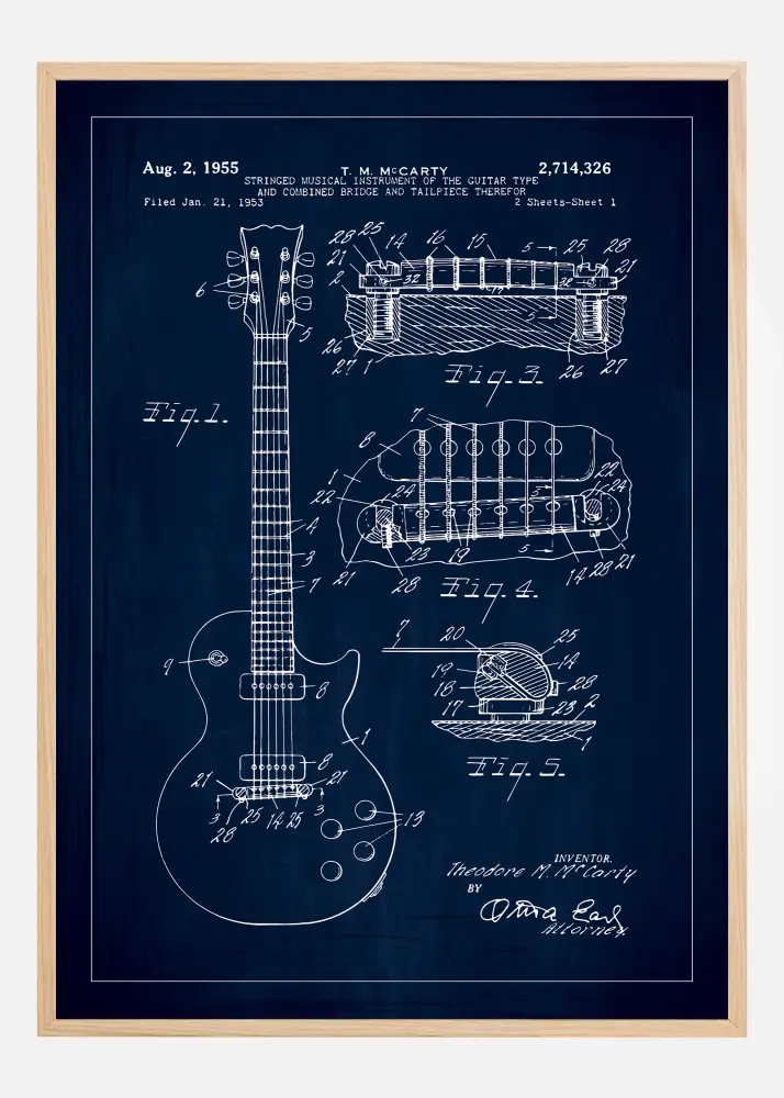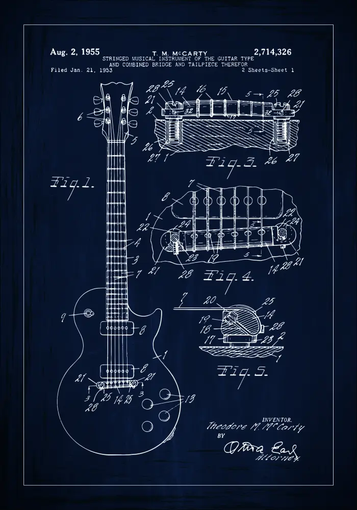 This patent poster shows a detailed and precise drawing of a stringed musical instrument from August 2, 1955, with patent number 2,714,326. The patent for this instrument, which many would recognize as an electric guitar, was registered by Theodore M. McCarty on January 21, 1953. The poster depicts the instrument in an elegant overall view as well as in technically advanced detailed views, highlighting the innovative design and the combined bridge and tailpiece as part of its unique features.