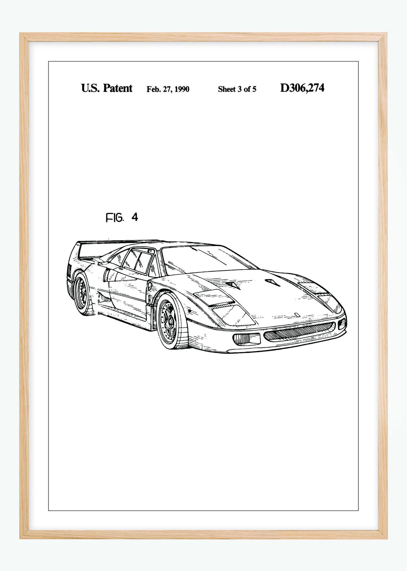 This patent poster depicts a groundbreaking design of a Ferrari F40, meticulously detailed on February 27, 1990, under patent number D306,274. The illustration showcases a side view of what would become one of the most iconic sports cars in history, known for its aerodynamics and distinctive style. It is a depiction of innovation and progress in the automotive industry, capturing the viewer's eye with its sharp lines and dynamic form.