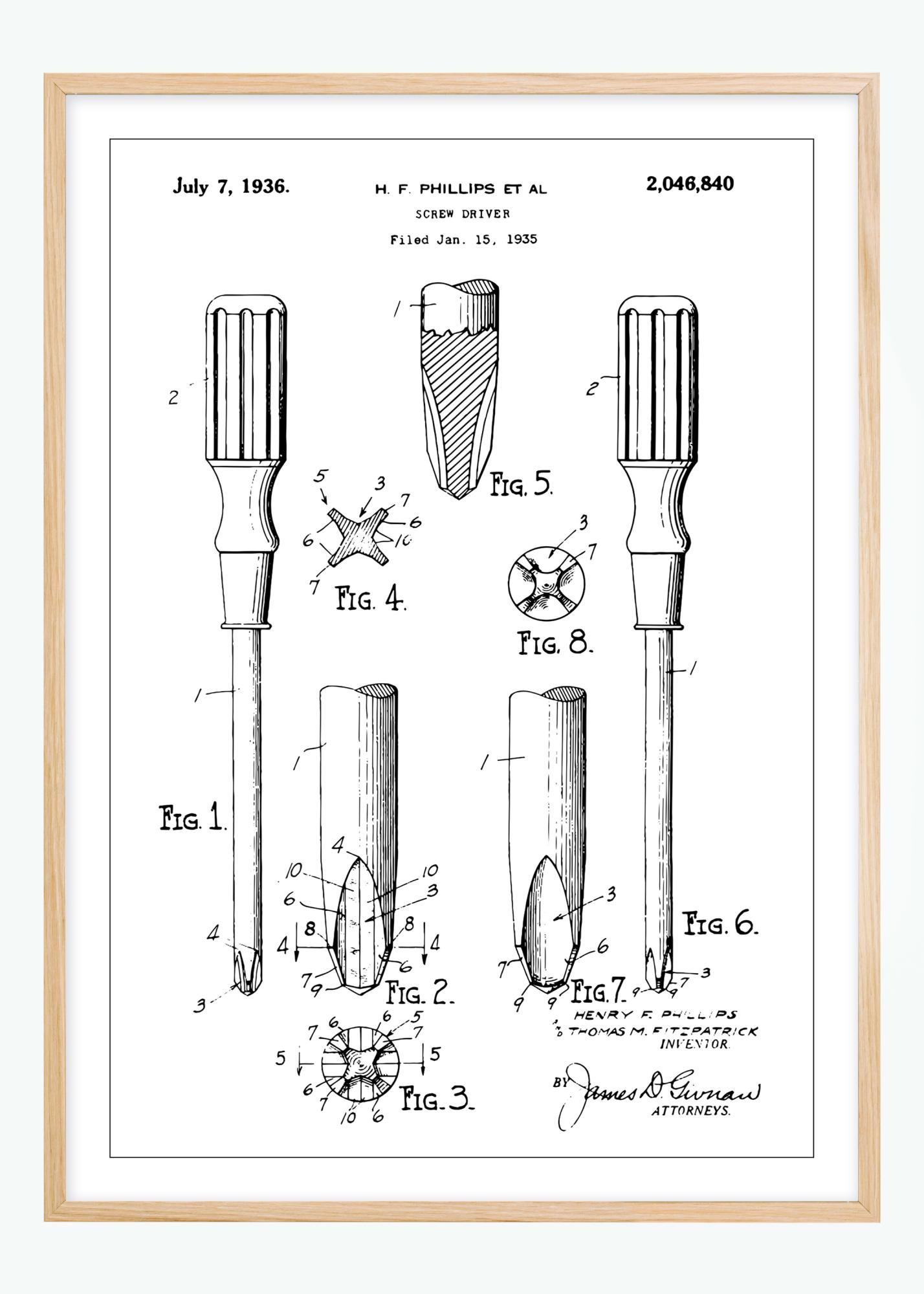 Presented here is a classic patent poster that depicts the design of a screwdriver, an indispensable tool classic in every craftsman's toolbox. Dated July 7, 1936, and filed January 15, 1935, this patent poster shows with precise details the construction and innovation behind the tool, from its iconic handle to the tip's unique shape. The inventors H.F. Phillips and others, with this patent, number 2,046,840, created a standard in the tool industry that we still rely on today.