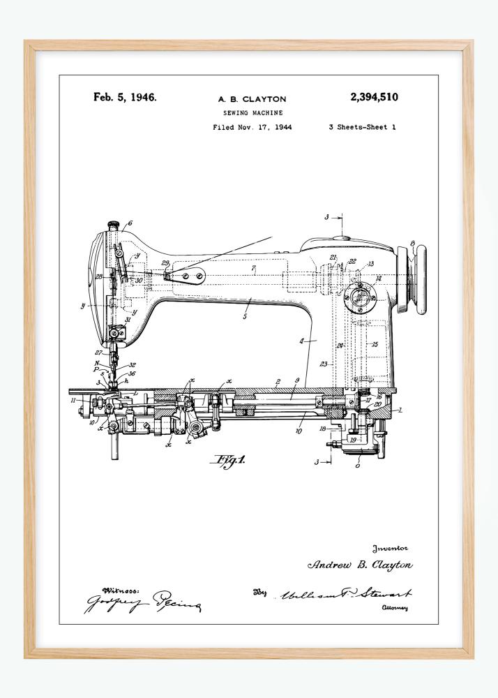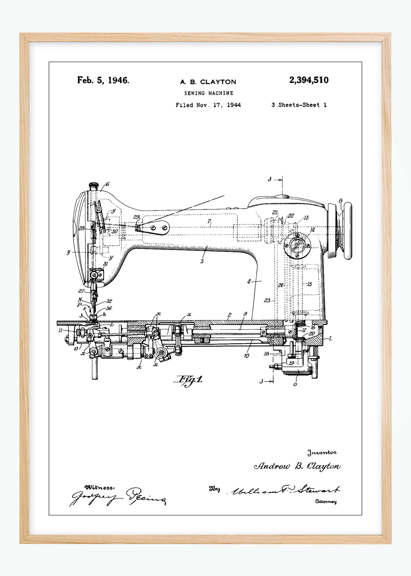 This detailed patent drawing of a sewing machine is a perfect illustration of industrial art and innovation, signed by the inventor Andrew B. Clayton. Copyrighted on February 5, 1946, and filed on November 17, 1944, this patent poster portrays the classic craftsmanship and precision behind machine sewing. With its complex components and technical lines, this patent poster offers a unique insight into the early 20th-century technological advancements and is a stylish decor piece for anyone who appreciates historical innovation.