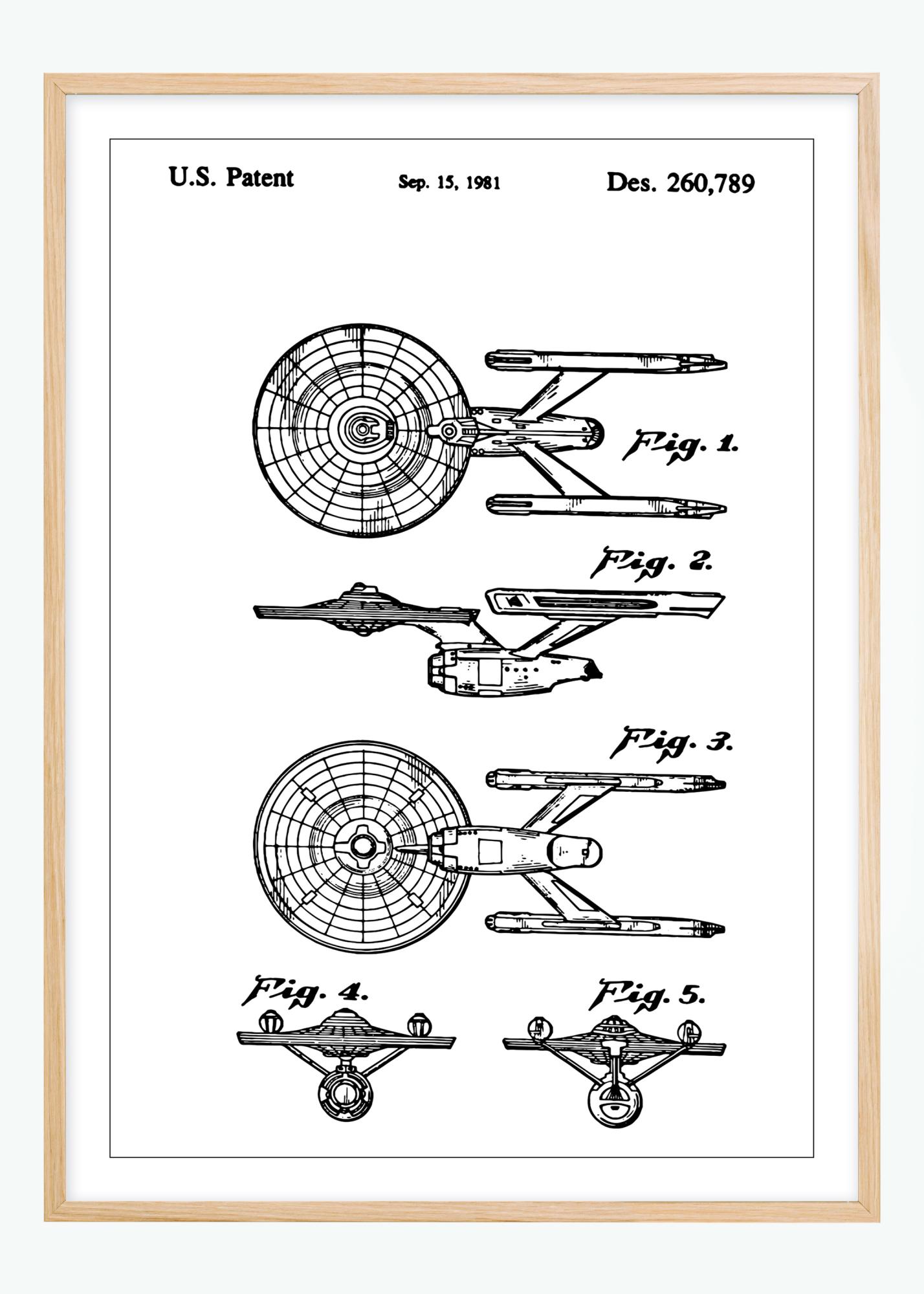 This patent poster shows a detailed drawing of the Enterprise from Star Trek, granted a patent on September 15, 1981, under number Des. 260,789. The five figures illustrate the fan from different angles, providing a comprehensive view of its construction and design. The drawings highlight the technical structure and the aesthetic execution of this everyday appliance.