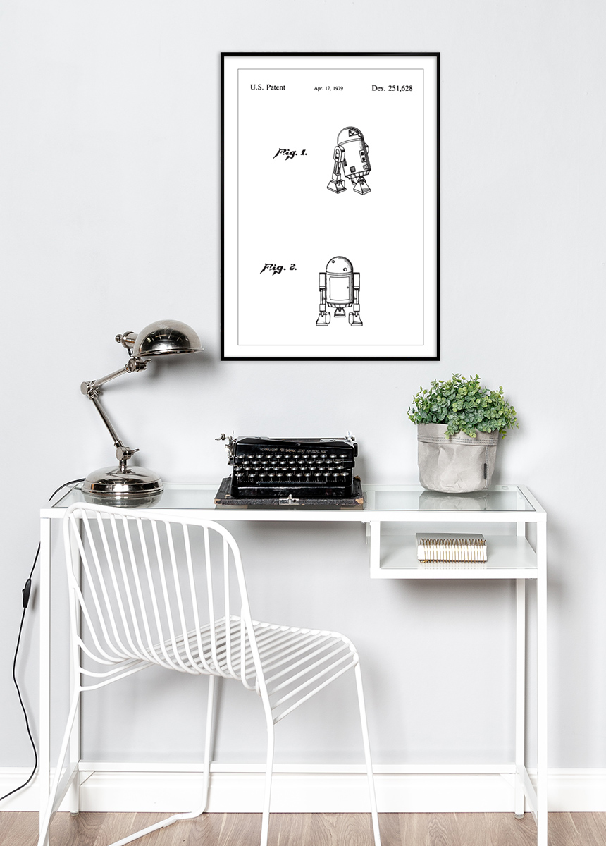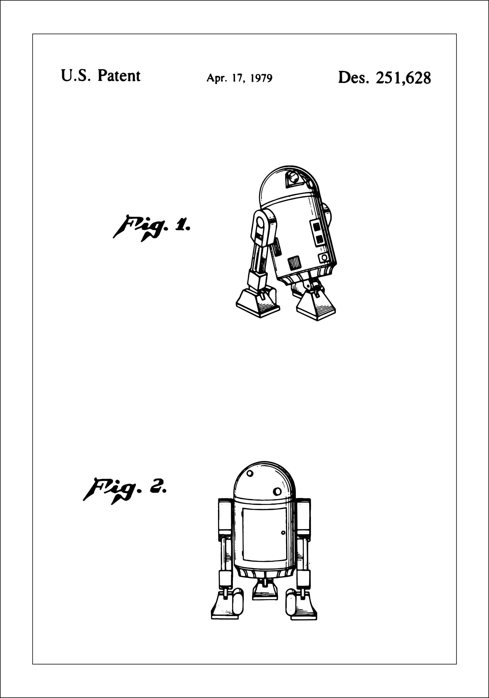 This fascinating patent poster captures the essence of retrofuturism with a design for an R2D2 from Star Wars, reflecting the period's visionary look towards the future of technology. With an American patent dated April 17, 1979, under registration number Des. 251,628, this motif illustrates two perspectives of an iconic robot figure, a complete profile, and a front view. It is a timeless patent drawing that both celebrates and documents the late 20th century's advancements in robotics and its influence in popular culture.
