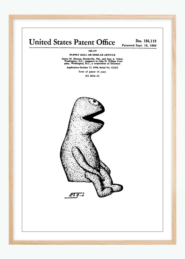 This patent poster depicts the design of Kermit, a piece of toy innovation that was officially documented on September 15, 1959, under patent number Des. 186,119. The illustrated figure shows a single side view of the puppet, which with its distinct and charismatic form offers a glimpse into toy design during the mid-20th century. This was a time when design and creativity began to gain greater significance in the toy industry, of which this puppet is an example.