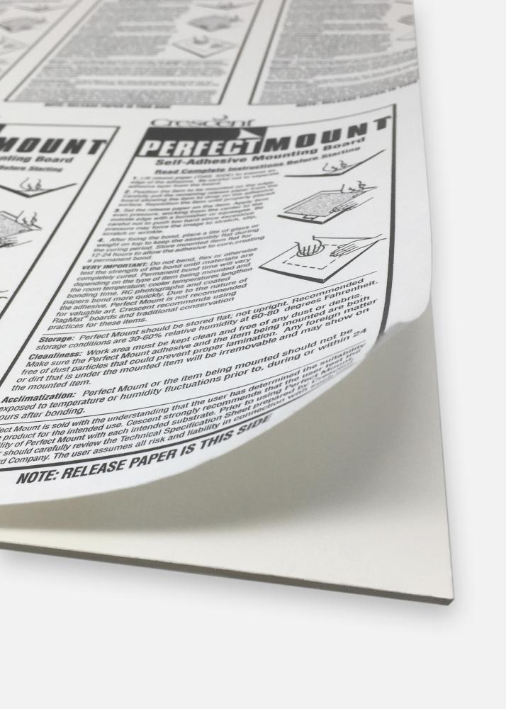 Perfect Mount is a 1.4 millimetre thick mounting board with double-sided adhesive for mounting pictures and photographs. The board is made of acid-free and PH-neutral materials for the best possible preservation of your pictures. The glue on the plate is activated by pressure, meaning that you can put your picture on it, remove it, and move it around until you're satisfied. To remove any bubbles, you can wipe the surface of the picture with a soft cloth or cotton glove, starting from the centre and working your way outwards. Then apply pressure to the board to attach the picture permanently.